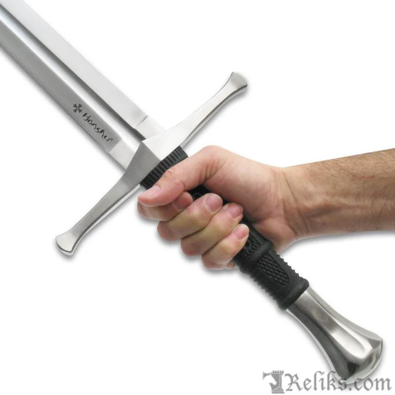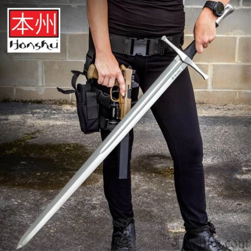 The Honshu Broadsword represents a modern spin on a proven, time-tested sword design with sleek, rugged tactical engineering and perfect blade-to-hilt balancing. It has a razor-sharp, 33 3/8” 1060 high carbon steel blade that has a partial blood groove, which leads up to the hefty traditional handguard. The rugged TPR hilt gives you a no-slip grip and both handguard and pommel are satin-finished stainless steel. The 43 1/2″ overall length broadsword fits securely in a black wooden scabbard that includes a leather belt hanger. Honshu continues to expand its exceptional sword line and this sleek, tactical broadsword is a must-have for your collection!