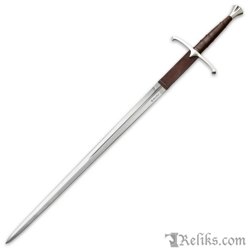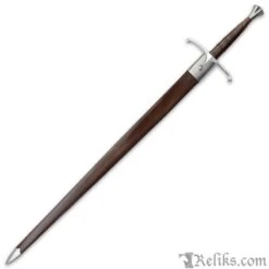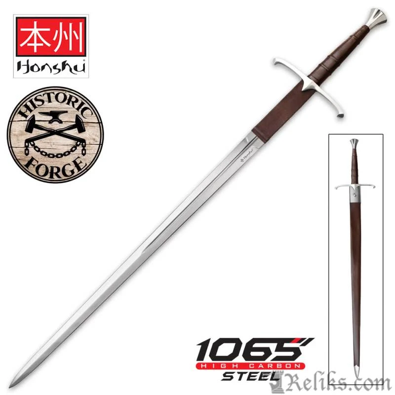 The Honshu Historic Claymore Sword is an exceptional addition to the Honshu Historic Series. It’s a time-tested sword design with modern engineering. The 43 1/2” 1065 high carbon steel blade has a deep blood-groove and has a genuine suede wrap below the polished steel handguard. The wooden handle is wrapped in genuine brown leather with embossed cord grooves and the pommel is polished steel. The 57” overall Claymore sword slides smoothly into a premium brown leather scabbard with polished steel accents. Honshu continues to expand its exceptional sword line and this tactical Claymore sword is a must-have for your collection!
