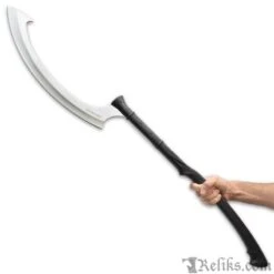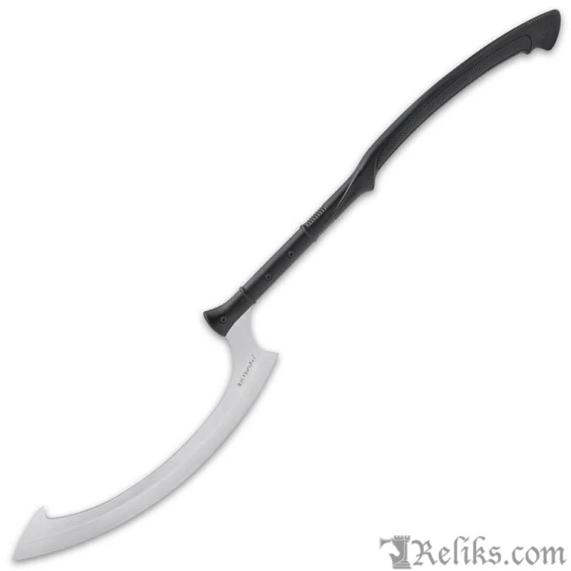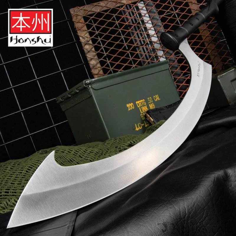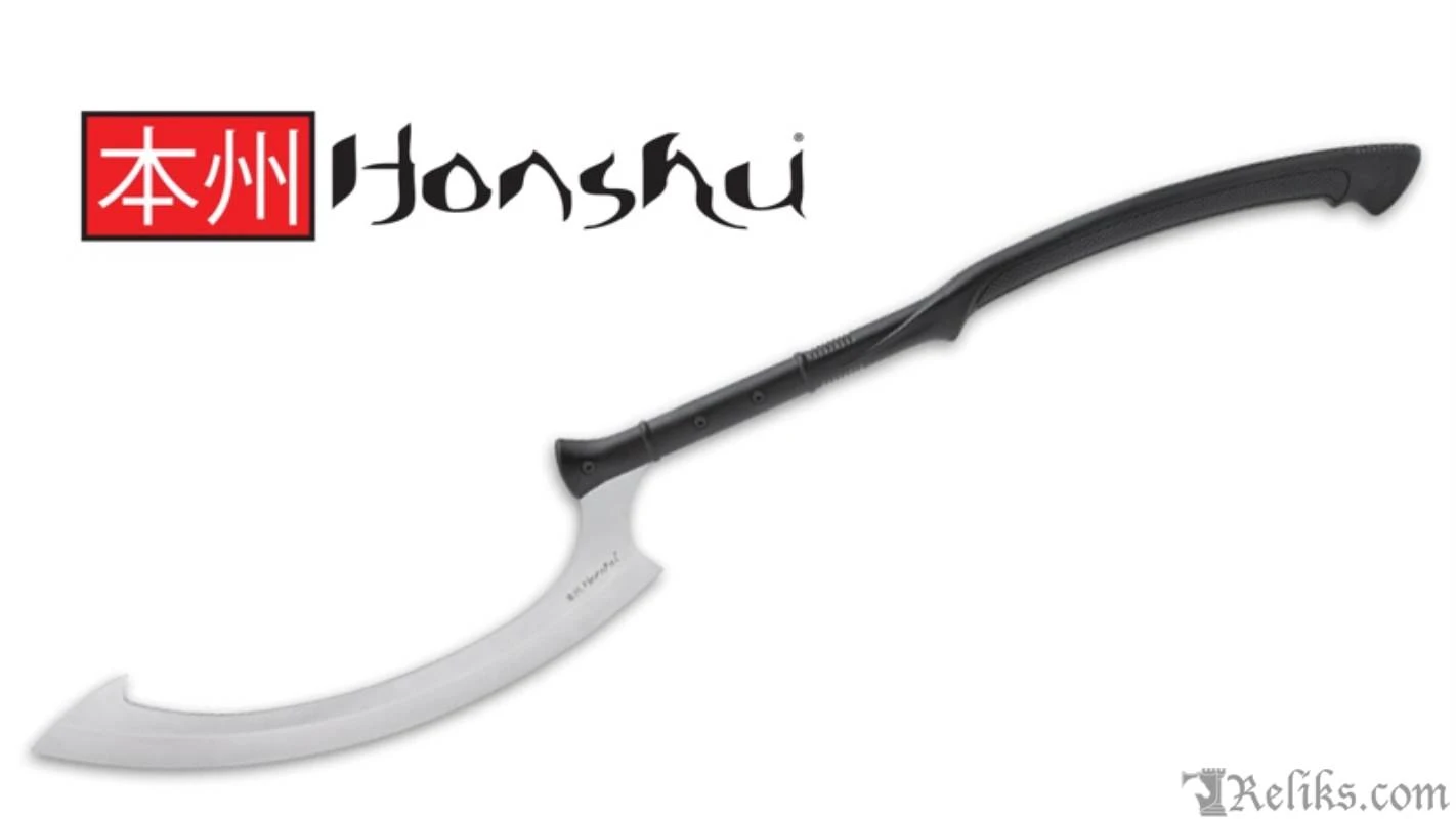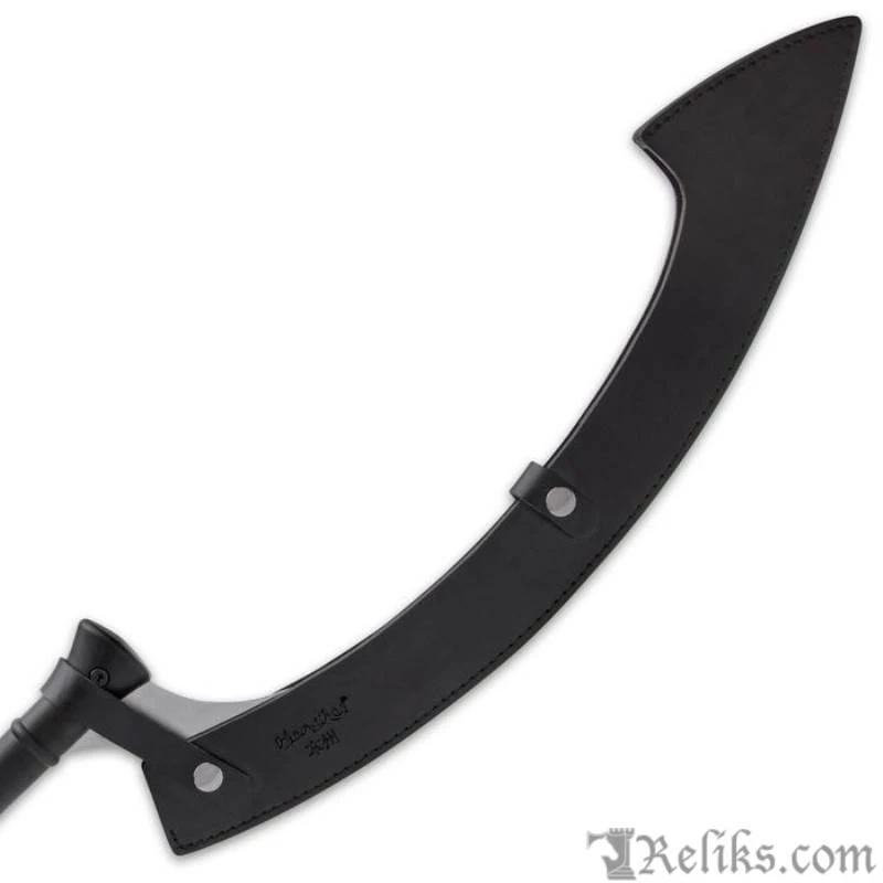 The Honshu Khopesh is a reimagining of the Egyptian sickle-shaped sword that have been found in the burial chambers of Pharaohs. The Egyptian sword has a razor-sharp, 19 1/2” curved, 7Cr13 stainless steel sickle-style blade with a satin finish. The curved handle is crafted of impact-resistant, injection molded nylon and it has a heavily EDM textured grip. The 45 1/8” overall khopesh sword comes with a premium leather blade cover with a double-snap closure.
