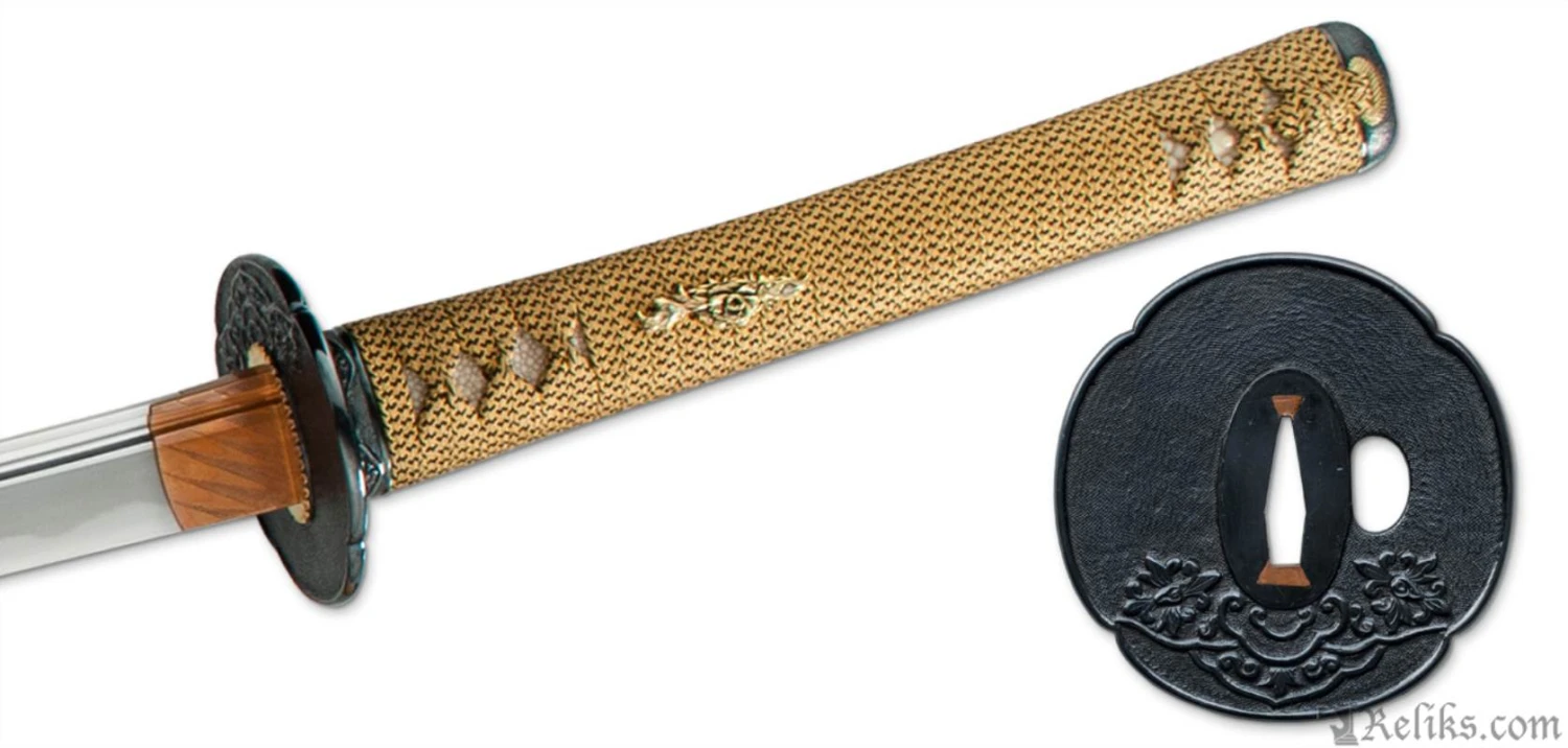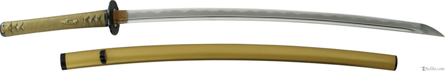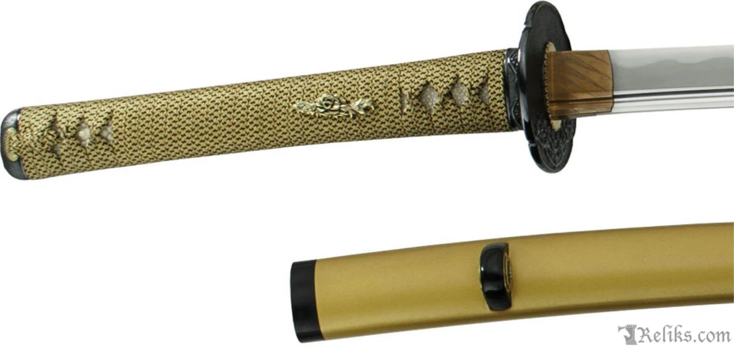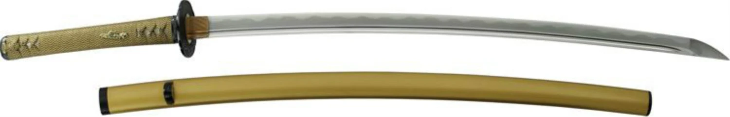 This is the fourth of the Limited Edition katana from Citadel Knives and Swords. Each sword is signed by the smith on the nakago with the sword number, limited to just 40 swords before the model is retired. The Imperial katana is themed in the symbolic flower of the royal family of Japan, the Chrysanthemum. In addition the golden color of the handle and saya represent the warrior’s courage. A sword fit for an emperor, or his most trusted general. This is an exceptionally well balanced sword with a hand forged and differentially hardened DNH7 High Carbon Steel blade. Each blade is hand polished using traditional stones and powders to produce an authentic look. This sword features a full length bo-hi or fuller to lighten and balance the blade. The hi continues through the habaki and into the nakago, with the copper habaki forged to follow the hi. Each fitting (tsuba, fuchi, kashira) is meticulously hand crafted in pure iron. Each piece is therefore slightly unique and held to a high standard of excellence. Citadel is one of only a handful of sword makers worldwide that still produces fittings in this manner. The tsuka is carved to each individual sword ensuring a tight friction fit with a full same-gawa wrap. The ito or handle wrapping is two-tone hand wrapped silk imported from Japan wrapped in a Katate-Maki or battle-wrap style. The saya is a work of art in its own right, showing off the masterful lacquerwork that Citadel is capable of achieving in the excepational golden metal-fleck style. Each saya is painstakingly hand carved for the individual sword ensuring a proper snug fit. An astounding and notable sword, once 40 of these samurai swords are produced we will make no more. Certificate of Authenticity is included.