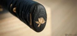 The blade of the Kaeru wakizashi is hand-forged and folded from powder steel, with a medium-length (chu) kissaki. The saya is deeply lacquered in black. High quality ray skin (same) is used on the tsuka. The tsuka-ito is made of premium dark blue Japanese cotton. The tsuba is expertly cast in stainless steel and patina’d like blackened iron, with detailing in gold and silver and a frog on lily pad scene decoration. The silk sageo compliments the theme of the Frog and is elegently woven in dark blue and moss green. The fuchi and kashira are of black with brass detailing, and the kojiri, koiguchi and kurikata are of polished buffalo horn. The habaki is a one-piece brass construction.