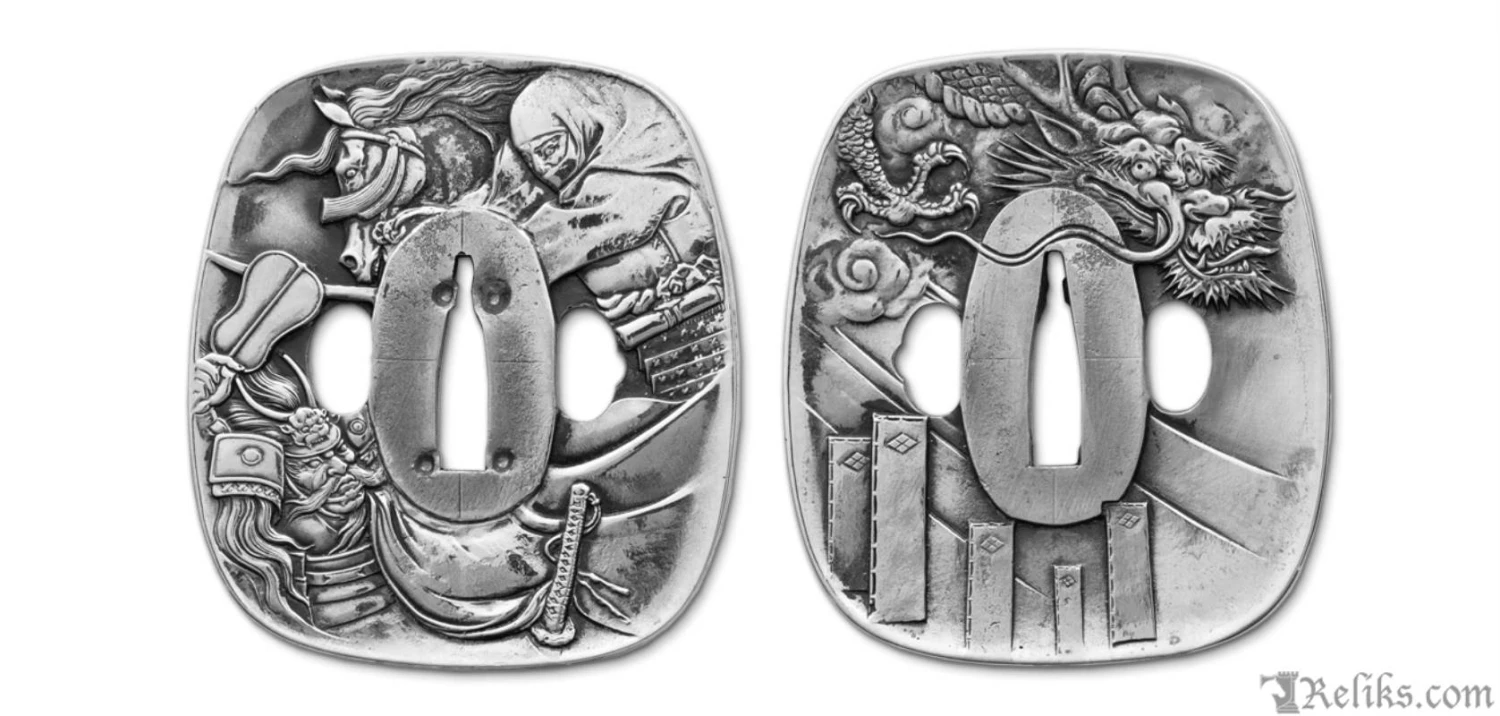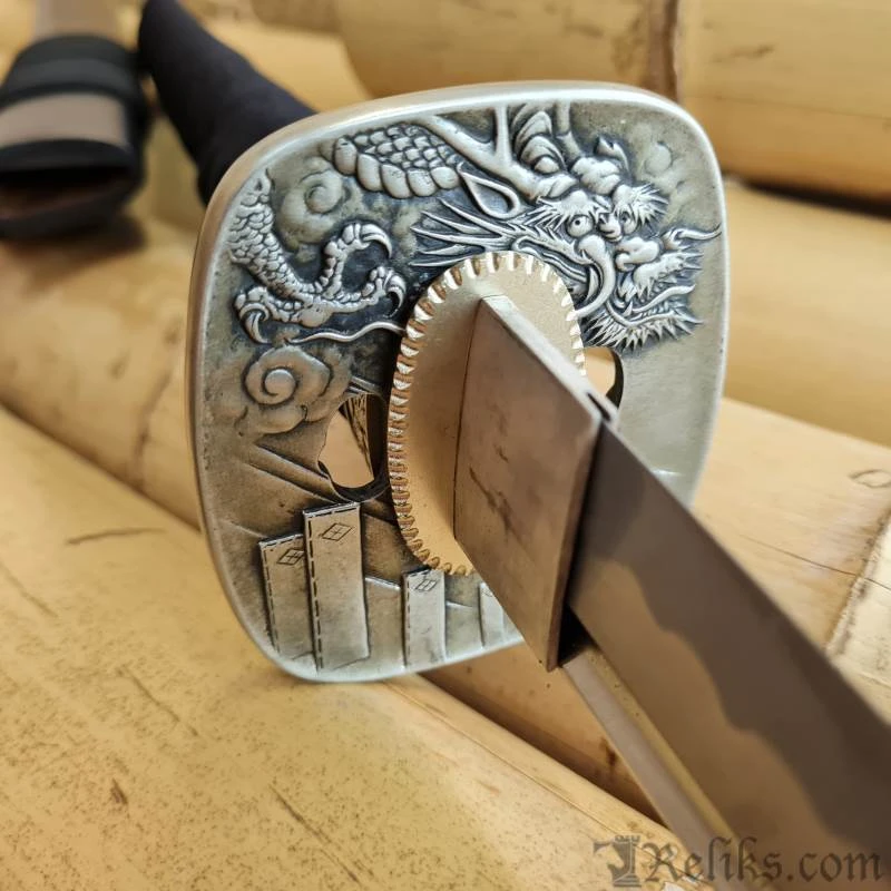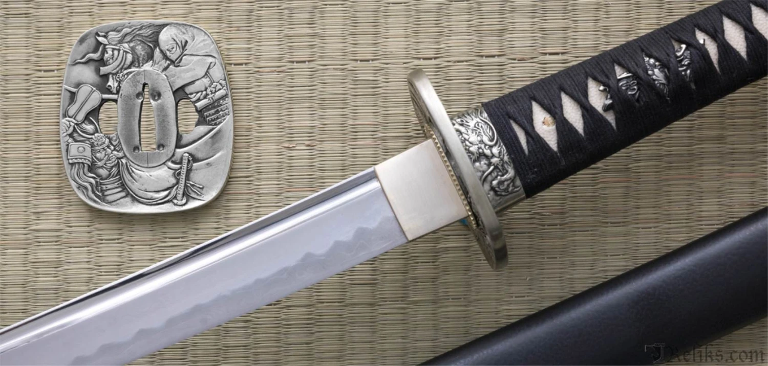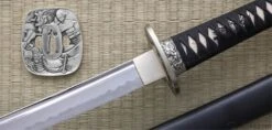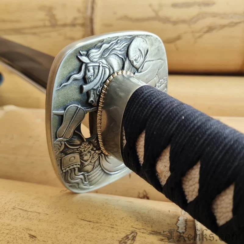 This beast of a blade is 28″ long with a deep hi to lessen the weight. The mixture of T10 and 9260 steel give the blade very pronounced hada which can be easily seen in the dark hamon. The 13 3/8″ tsuka is wrapped in black silk over real same. The tsuba depicts Uesugi Kenshin and Takeda Shingen engaged in combat. The black textured saya is wrapped in black sageo. The Kawanakajima katana will be a prize for collectors or a practitioners workhorse for heavy cutting.