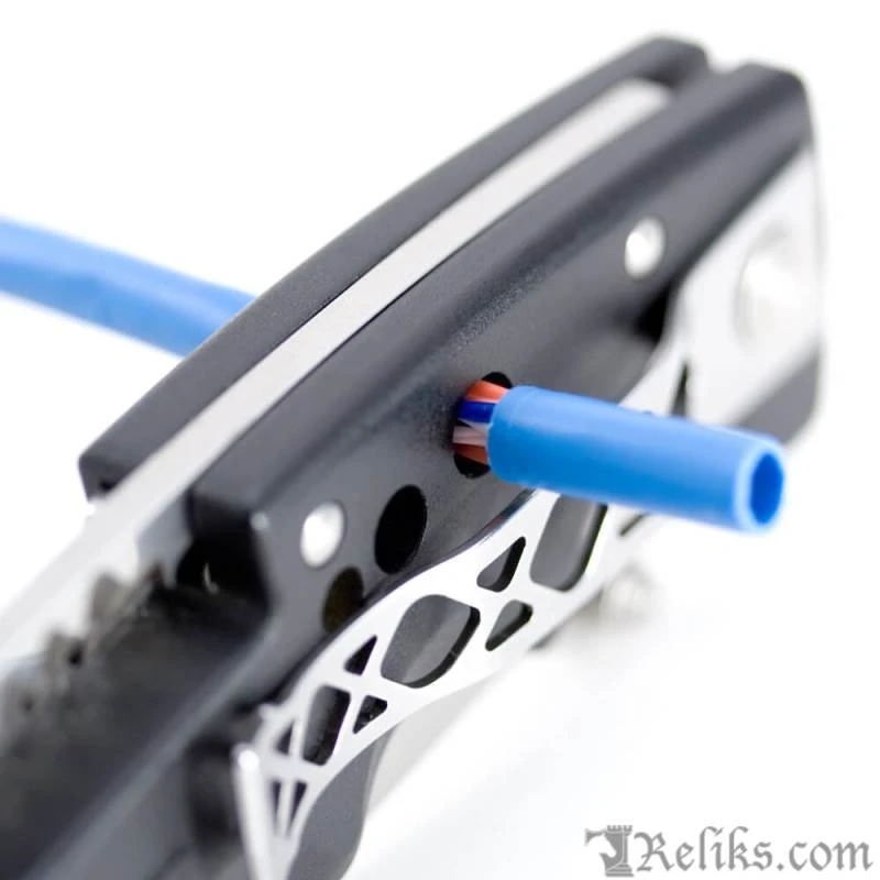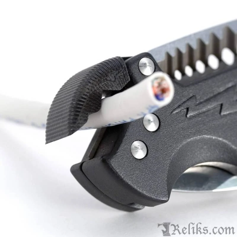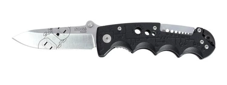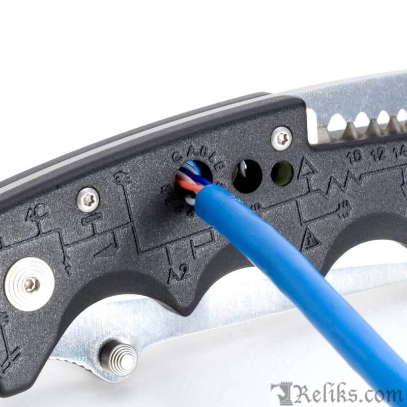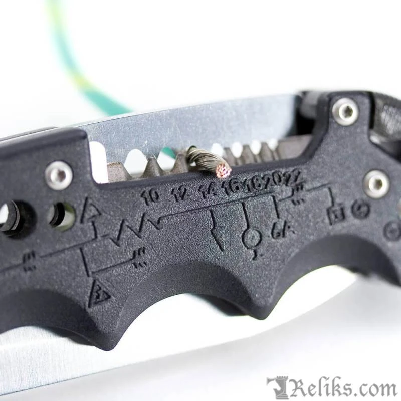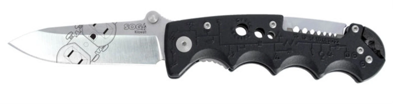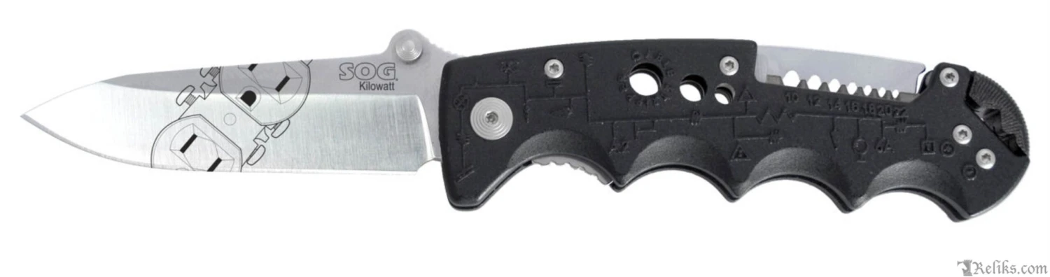 Get “charged up” with the Kilowatt, the first working theme knife designed for the electrician, homeowner, contractor, or anyone who might need to strip wire in a pinch. Three separate systems address wire from fine multi strand all the way up to cable. There is a stripper bar for wire sizes of 12-24, an adjustable spring-loaded UPT/wire stripper in the back, and just in case, our patent pending hole stripper that uses the main blade. Schematic grips, hi voltage tower clip, insulator thumb stud, and a blade with receptacle engraving are signatures that make this a very unique liner lock knife.
