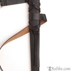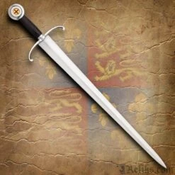 Ewart Oakeshott, renowned English sword enthusiast, researcher, and author of crucial books about the sword, described Henry V’s sword as “…one of the most beautiful medieval swords to handle I have ever known. …it is balanced like a good fishing rod.” It is a sword that was designed to be a superb weapon – simple, practical, and of high quality. The enormous, thick pommel looks misleadingly heavy, but is actually hollow. The raised rims on either side were brazed onto an inner iron disc. The recesses in the pommel were gilded with gold and accentuated with painted red crosses at the time of the king’s funeral. The sword was hung above King Henry’s chantry at Westminster Abbey until at some point it was stowed away in an old chest. In 1951, it was discovered, cleaned (by Mr. Oakeshott himself!), and added to the display of King Henry’s other accoutrements – his helm, shield, and saddle – in the Abbey museum. It was obviously well-used; the blade appears to be slightly narrowed from multiple sharpenings. The original grip is long gone, the current wood grip is thought to be a rough replacement. This sword is labeled a type XVIII in Oakeshott’s Records of the Medieval Sword. As a prince at the age of 16, Henry was nearly killed by an arrow that penetrated his face. As king, he led a small band of knights and archers to victory over a much larger French force at the Battle of Agincourt, one of the most stunning accomplishments in English military history. This sword from Windlass Steelcrafts is a precise replica of the iconic sword of Henry V. Like the original, it’s a relatively short weapon, designed for fast cutting and thrusting. The blade is slightly hollow ground and the edge is sharpened at the factory. It’s beautifully balanced and feels lively in the hand. The pommel is hollow like the original and is appropriately gold plated in the recesses, and has red enamel crosses emblazoned on each side (we used enamel instead of paint for the sake of durability). An accurate, fully functional replica of a true battle sword once used by the king of England. A design with just enough flair for a sense of elegance, but no doubt a pragmatic, effective cutting weapon. Includes top-grain leather scabbard and belt.