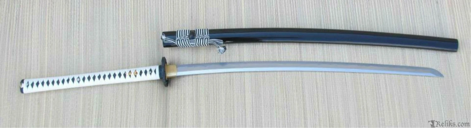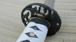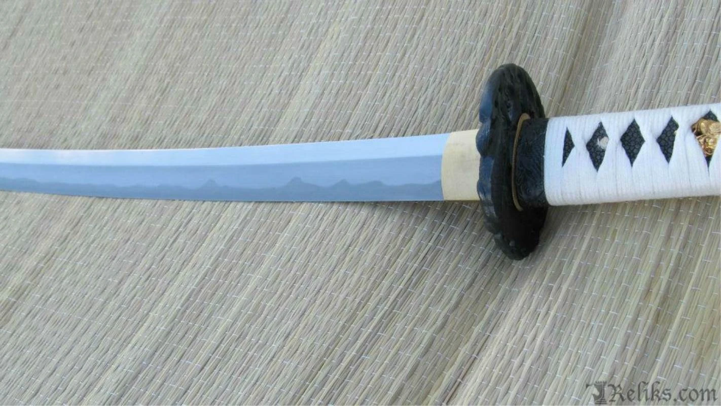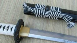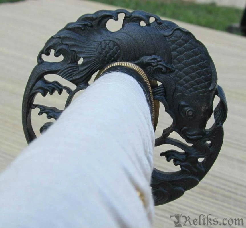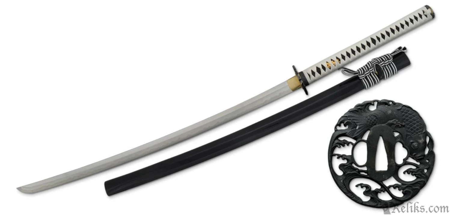 The Koi Katana from Paul Chen has a hand-forged T10 high-carbon steel blade. The blade on this katana is differentially hardened using the traditional claying method. The Koi Katana is mounted in black and white and features black same, the tsuka-ito is made of premium white Japanese cotton. The saya is finished in a deep black lacquer with a black and white striped cotton sageo. A finely rendered Koi, with true front-and-back detail, forms the black iron tsuba. The fittings are superbly antiqued adding to the aesthetics of the piece. The Koi katana from Hanwei is supplied with a protective cloth bag and traditional maintenance kit. It is said that a Koi swims up rivers and climbs waterfalls with bravery not unlike a Samurai warrior. As well, it is said that if a Koi is caught, it will lie still beneath the knife, facing its death bravely like a Samurai facing a sword.