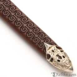 The original scabbard had long since deteriorated, so we created one of high-quality leather and laser-engraved it with a pattern created from the pommel imagery. The scabbard comes with its own belt.