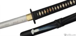 The Lion Dog Katana features an O-Kissaki blade of Hanwei’s own high-alloy HWS-1S steel, which combines superior performance with an outstanding O-choji hamon. This steel is made in Hanwei’s new factory, with high-tech equipment, producing a very pure advanced-metallurgy blade with the best edge-holding capability and resilience of any blade ever produced by Hanwei. The outstanding performance characteristics of blades forged from HWS-1S steel derive from a combination of the careful selection of alloying elements and a complex processing procedure, basically involving the manipulation of the steelÂ’s carbon content across the blade section. This results in a very tough and resilient blade with a hard, highly abrasion-resistant edge. The sharply detailed fittings feature a Lion-dog themed black iron tsuba, with matching fuchi/kashira and golden peony menuki. The complex saya features a gloss-lacquered ribbed section at the koiguchi/kurikata with the balance spatter-lacquered for a very attractive appearance. The premium multi-colored sageo is hand-woven in pure silk.