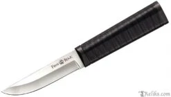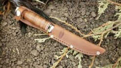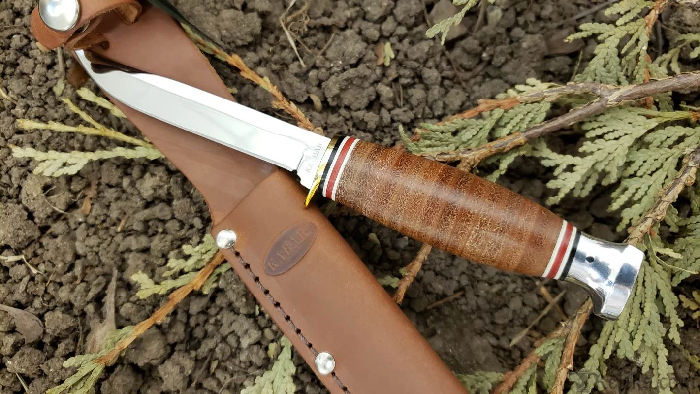 A classically styled leather handled hunter, the Little Finn has been a popular member of the KA-BAR product line since the early 1900’s. Features brass guard and aluminum butt cap. Plastic lined leather sheath included.