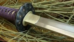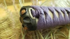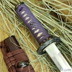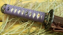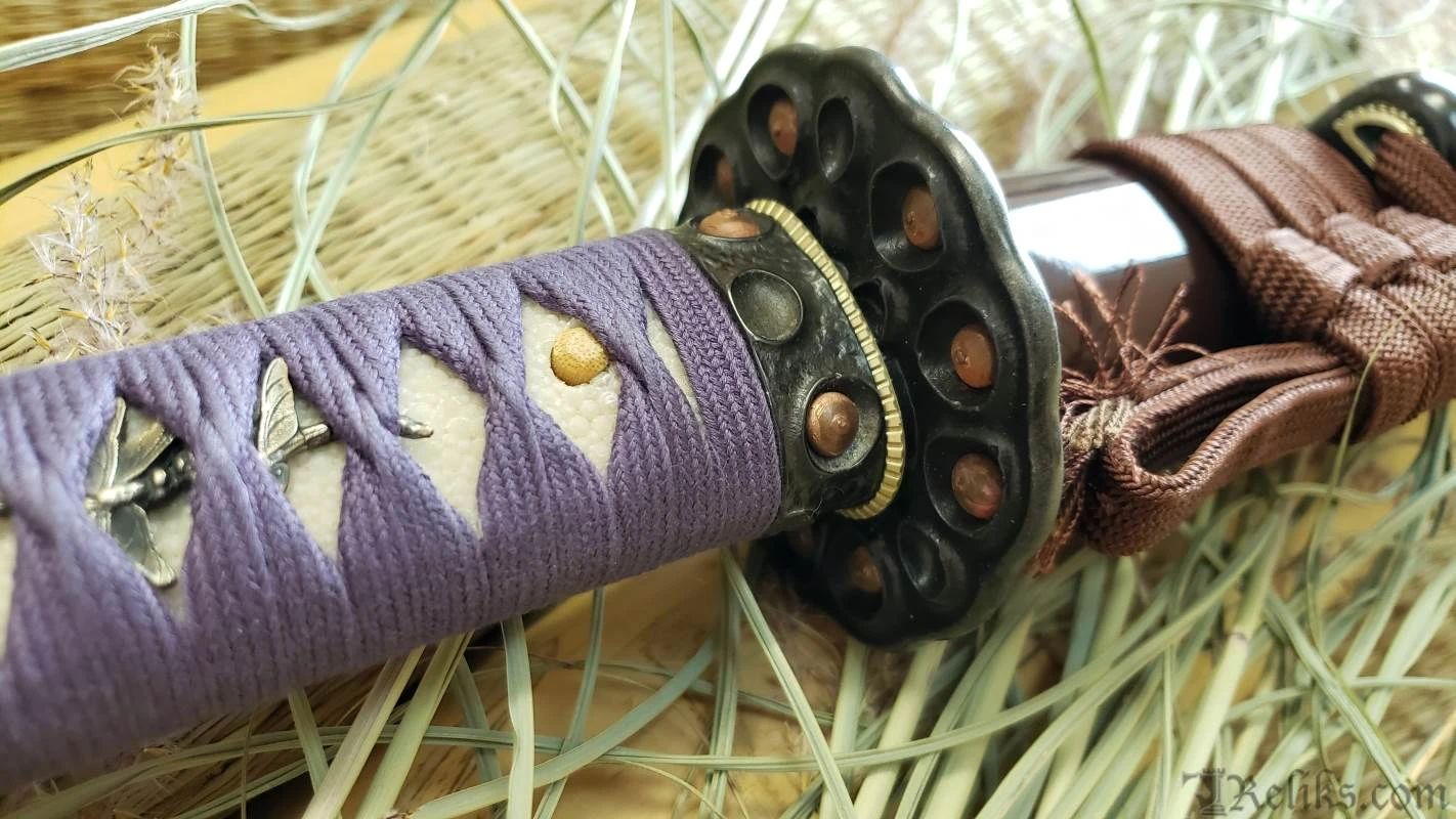 A beautiful symbol of the circular journey of enlightenment, the lotus seed starts its life in the muck before growing in to a stalk to emerge from the muddy water to blossom. As the bloom fades the maturing seeds fall back in to the mud to continue the cycle of rebirth, which is so beautifully depicted in our Lotus Seed Daisho set from Dragon King. Like the lotus blossom the Lotus Seed Katana transitions from various shade of violet from the wrapped cotton tsuka-ito , the sageo on the smooth deep, dark brown lacquered saya. Copper seeds accent the blackened furniture throughout the handle. The immaculately detailed budding seed pod following the shedding of its pedals centers the entire piece. Silver dragonfly menuki, seppa and habaki splash highlights across the 7″ tsuka. The 19 3/8” forged T10 blade features a midare or irregular hamon line much like the path of life with all of its ups and downs. The wakizashi completes the motif with a bold statement both physically and metaphorically without being audacious in design.