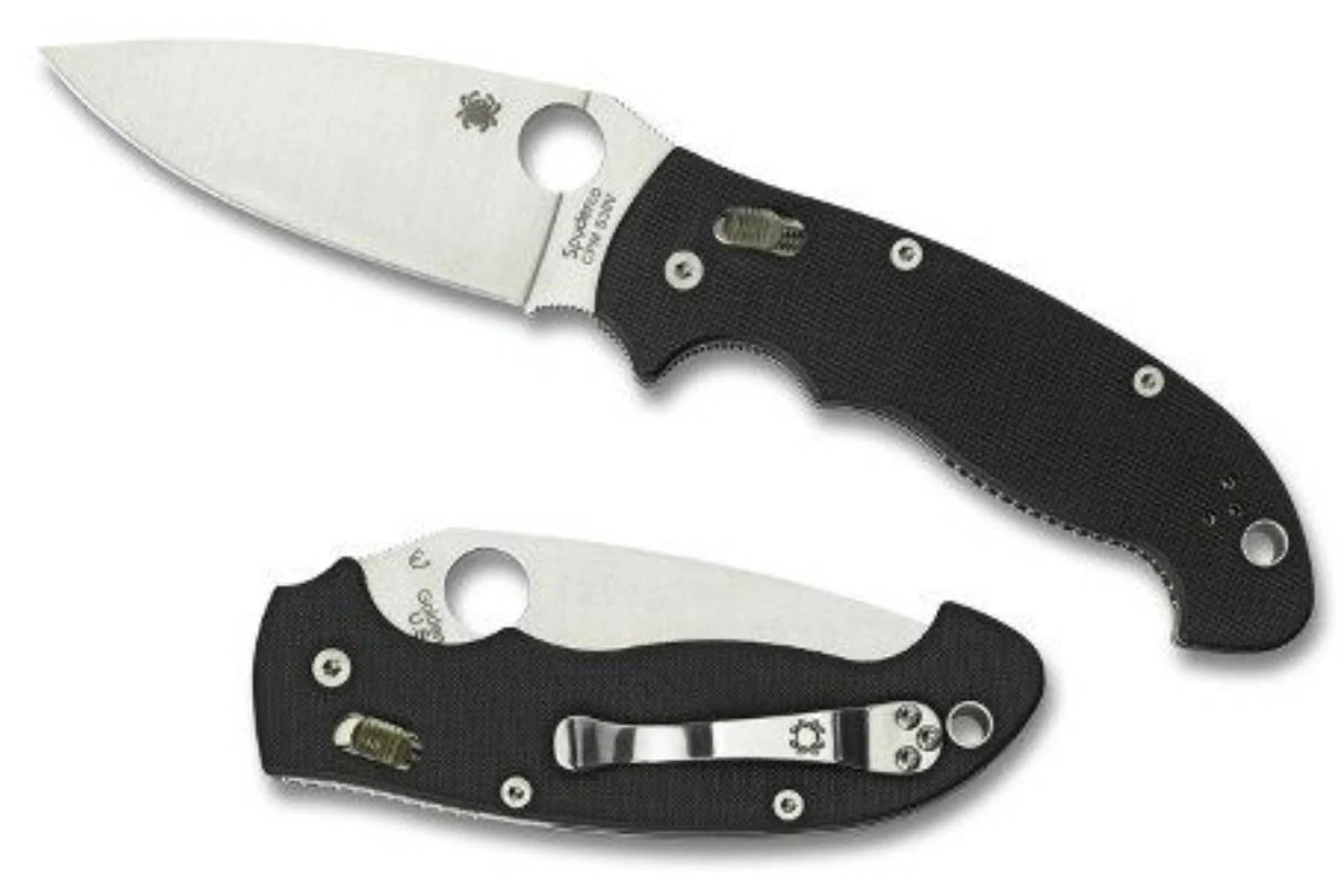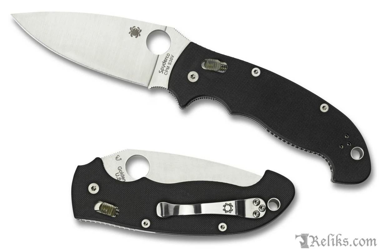 The large Manix2 is an oversized version of the Manix2 with a blade that is just under four-inches. The blade is locked open using Spyderco’s patented Ball Bearing Lock. The lock is comprised of a free-floating steel ball-bearing encased in a high-tech polymer cage. When opened, the ball bearing moves forward onto the blade’s ramp where it is wedged, locking the blade safely open. The spherical shape of the ball rotates freely allowing the lock to self-adjust across a large surface, ensuring smooth and confident lock-up every time it is opened. The blade is CPM S30V, ground full-flat and features jimping above the oversized 14mm Spyderco Round Hole. The liners inside the G-10 handle extend beyond the scales, creating a scalloped pattern around the handle’s perimeter for additional grip. This feature keeps the knife from slipping out in the hand and works well with gloves. The liners serve a double purpose by adding rigidity and lightweight strength to the handle. A three-screw clip can be positioned ambidextrously, tip-up for comfort and pocket carry. The knife also has a large lanyard pipe to protect various types of cords or thongs.