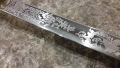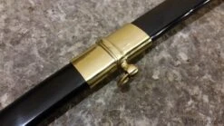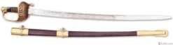 This fine reproduction saber is a faithful copy of ones used. The hand forged blade is British military spec steel that will flex over 20° and return to true. The leather handle is wire wrapped. Befitting their rank, this sword displays a high degree of ornamentation. The brass guard has hand chased foliage and “U.S.” between the branches. The blade is etched with foliage, military trophies, “U.S.”, “E Pluribus Unum” and “Iron Proof.” During the years before the war, many Confederate officers, including General Robert E. Lee carried this sword in the Indian campaigns. Brass pommel, scabbard is blue steel.