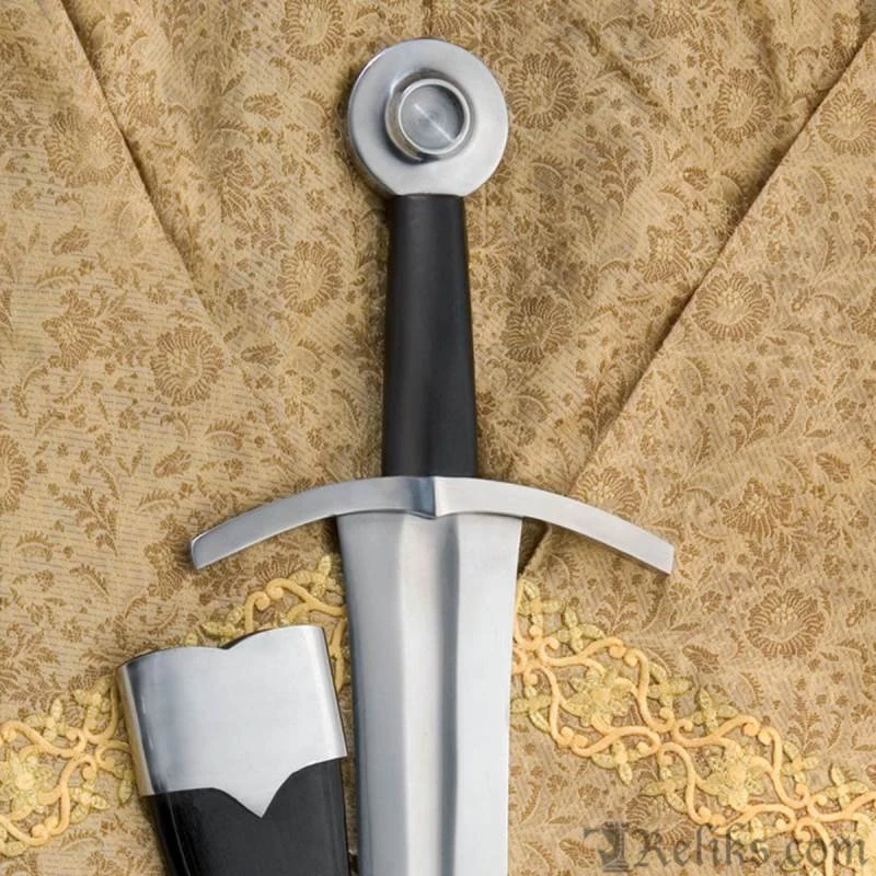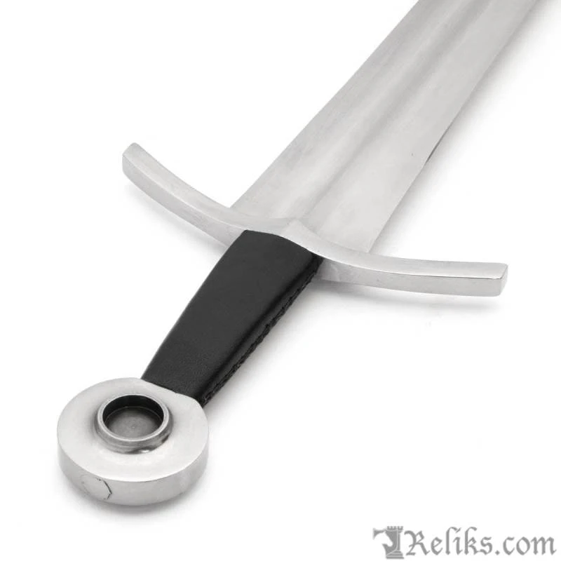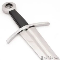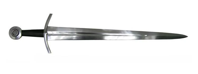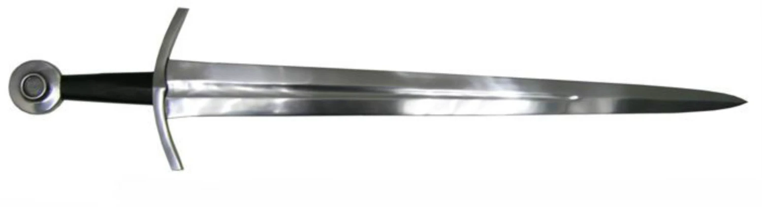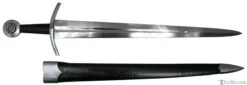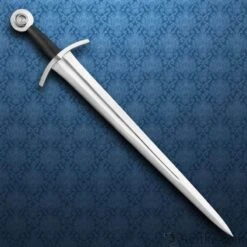 This medieval arming sword features a blade that swells slightly at the top to put more weight in the hand to improve its cut and thrust capabilities, making for a very fast sword. The furniture is steel and the grip is wood covered in leather. A very effective and important sword. Includes matching scabbard. Made by Windlass Steelcrafts. Can be seen in E. Oakeshott’s book “Record of the Medieval Sword”. Arrives sharpened from the factory.