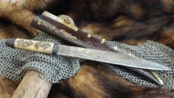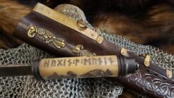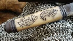 Are you ready to embrace your inner Viking? Look no further than the Hugin & Munin Odin Viking Seax. This impressive blade is a inspired by the historical weapons used by Viking warriors during the 9th and 10th centuries. Originating from the Scandinavian region, this seax represents a key component of Viking weaponry during a time when the Scandinavian warriors were feared across the world. The seax was a versatile weapon, used both in combat and everyday tasks. Its blade made it ideal for fighting, while its length and weight also made it perfect for hunting and other daily chores. The Hugin & Munin Odin Viking Seax is an exciting production of this iconic weapon. Crafted from high carbon steel and with close attention to detail, this seax will transport you back in time to the era of the Vikings. The handle is adorned with intricate engravings, featuring the revered ravens Hugin and Munin, who were said to provide wisdom to the god Odin himself. The blade has been purposly left raw to look as though it came directly from the pages of history! Whether you are a collector or a reenactor, the Hugin & Munin Odin Viking Seax is the perfect addition to your collection. Each seax comes with a leather scabbard for safekeeping, ensuring that it remains in pristine condition for years to come. So why not add a piece of Viking history to your collection and unleash your inner warrior with the Hugin & Munin Odin Viking Seax?