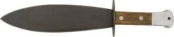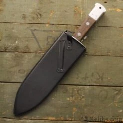 The odd-looking, but very effective Smatchet was the brainchild of William Fairbairn (who also co-developed the Fairbairn-Sykes Fighting Knife) during WWII for the OSS (Office of Strategic Services) and British SAS (Special Air Service) for use on clandestine missions behind enemy lines. There were many variations in the grip and pommel, but the basic specifications never changed. Our reproduction is based on an original piece loaned to us by a very generous collector (we matched it detail to detail). Features a high carbon steel, full tang, blued matte finished blade thats razor sharp on one cutting side and 1/3 of the reverse edge. The close-grained hardwood grips are held in place with 2 big rivets, the cast aluminum pommel (pinned in place) includes a lanyard hole. The hardwood-lined and black leather-covered sheath fits on belts up to 3-1/4″ wide. Our replica even features the angled belt loop on the sheath, just like the original!