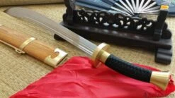 The Ox-Tail Dao or Kung Fu Sword is undoubtedly one of the best weapon-grade swords of its type commercially available. Unlike the many decorative and theatrical versions of this sword, the CAS/Hanwei product is a true replica of the originals. The saber is a traditional ox-tail design. The distal-tapered blade and traditional hand-tied grip make for excellent handling. A brass-mounted scabbard is included. Features include a distal taper high carbon steel blade which has great balance.