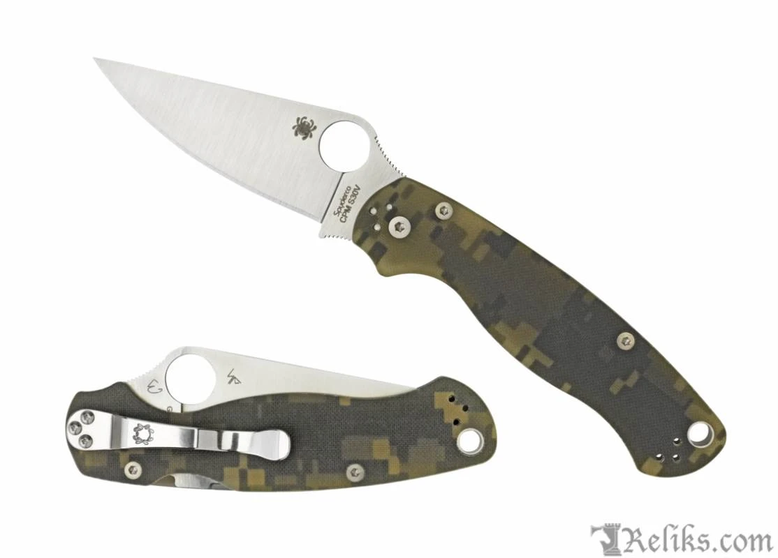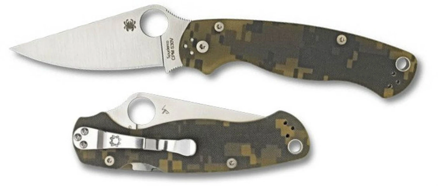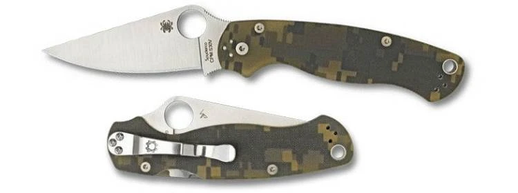 The Spyderco Para-Military2 Digital Camouflage G10 has several changes over the classic version. The G-10 handle is narrowed at the end improving the ergonomics. It features a Compression Lock and an ambidextrous-friendly four way clip which carries tip-up/tip-down, left/right-hand and rests deeper in a pocket. We kept the same high-performance CPM® S45VN full flat-ground blade but made its profiled thinner; removing angles that could catch on a pocket or clothing during deployment. We also lengthened the blade’s tip and added additional surface jimping to both the spine and finger choil. Implementation of a new Bushing Pivot System generates fluid action and more consistent manufacturing tolerances. Refinements to overall construction may not be drastic or even visible to the eye but from the G-10 textured handle to the CPM-S30V steel full flat blade, everything is sharper, smoother and guaranteed to provide performance and user comfort. Made in Golden, Colorado U.S.A.