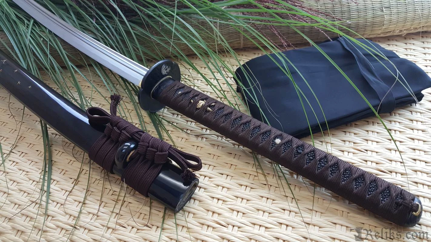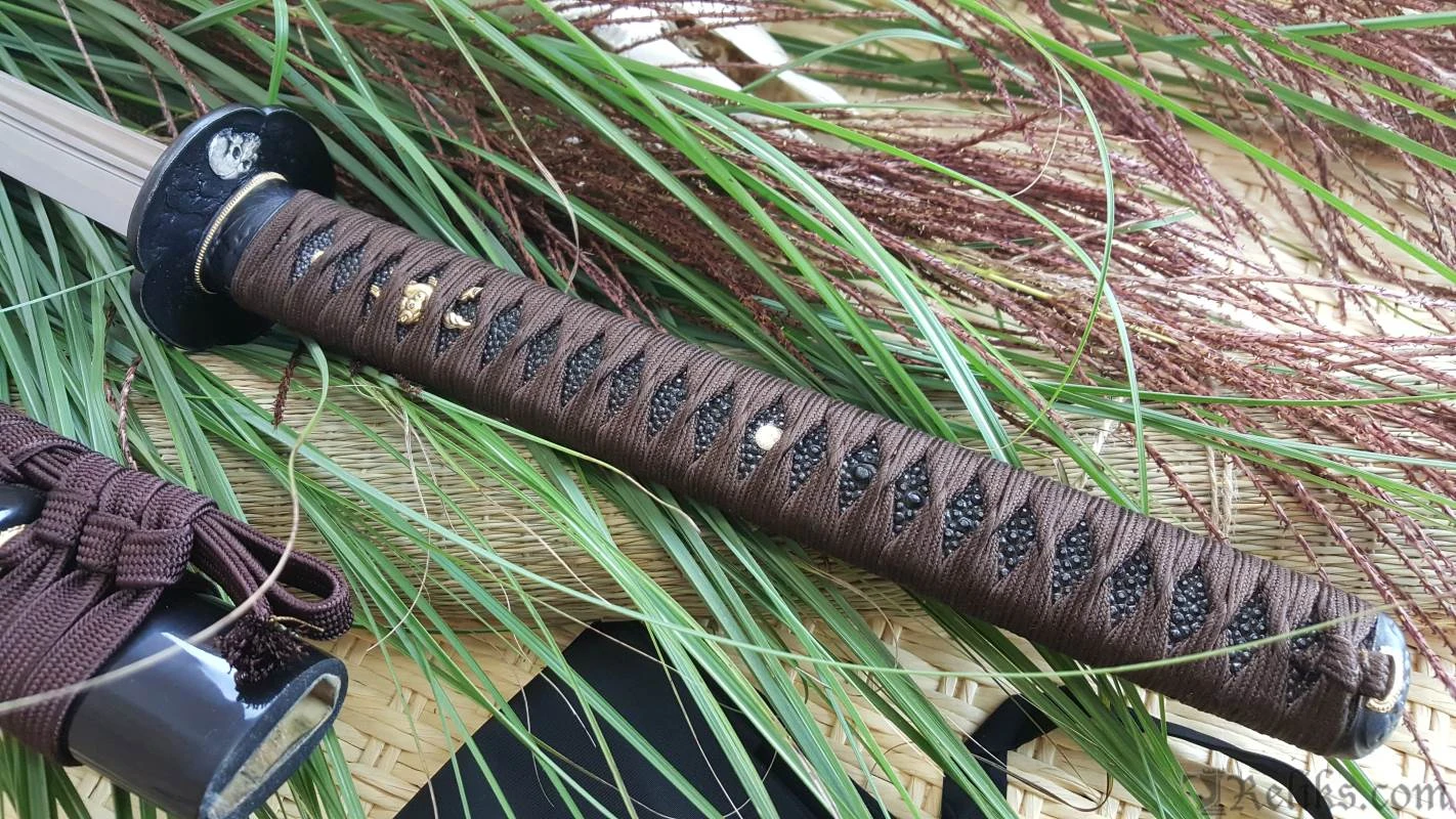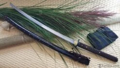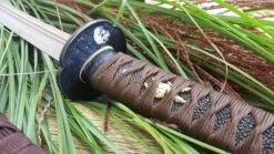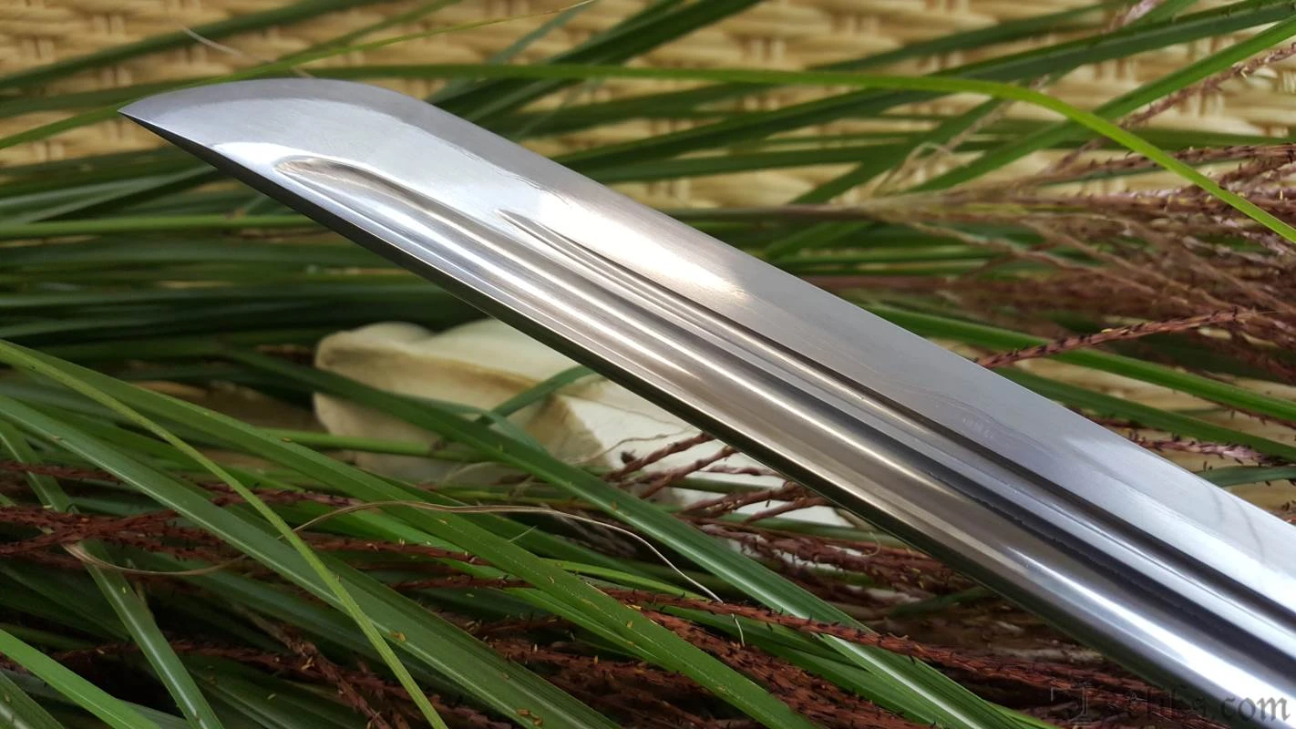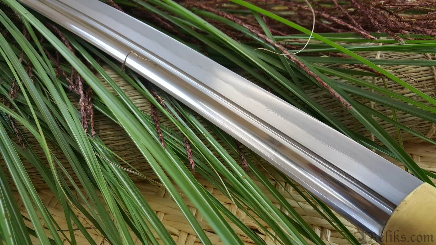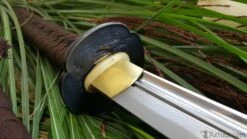 As each sword is hand forged there will be slight variation from one sword to the next. However, we measured the 28″ Blade/12″ Handle Model to give basic specification of the sword. The length (nagasa) is 28″ long. The thickness of the sword (kasane) at the habaki is 7mm tapering to 5.5mm at the transition to the tip. The “height” of the sword (motohaba) at the habaki is 32mm tapering to 24mm at the yokote (transition to the tip). The extended chu kissaki is 38mm long. And the blade has a gentle roughly 3/4 inch tori sori. Again, please note that each sword will vary slightly as each sword is hand forged and polished.