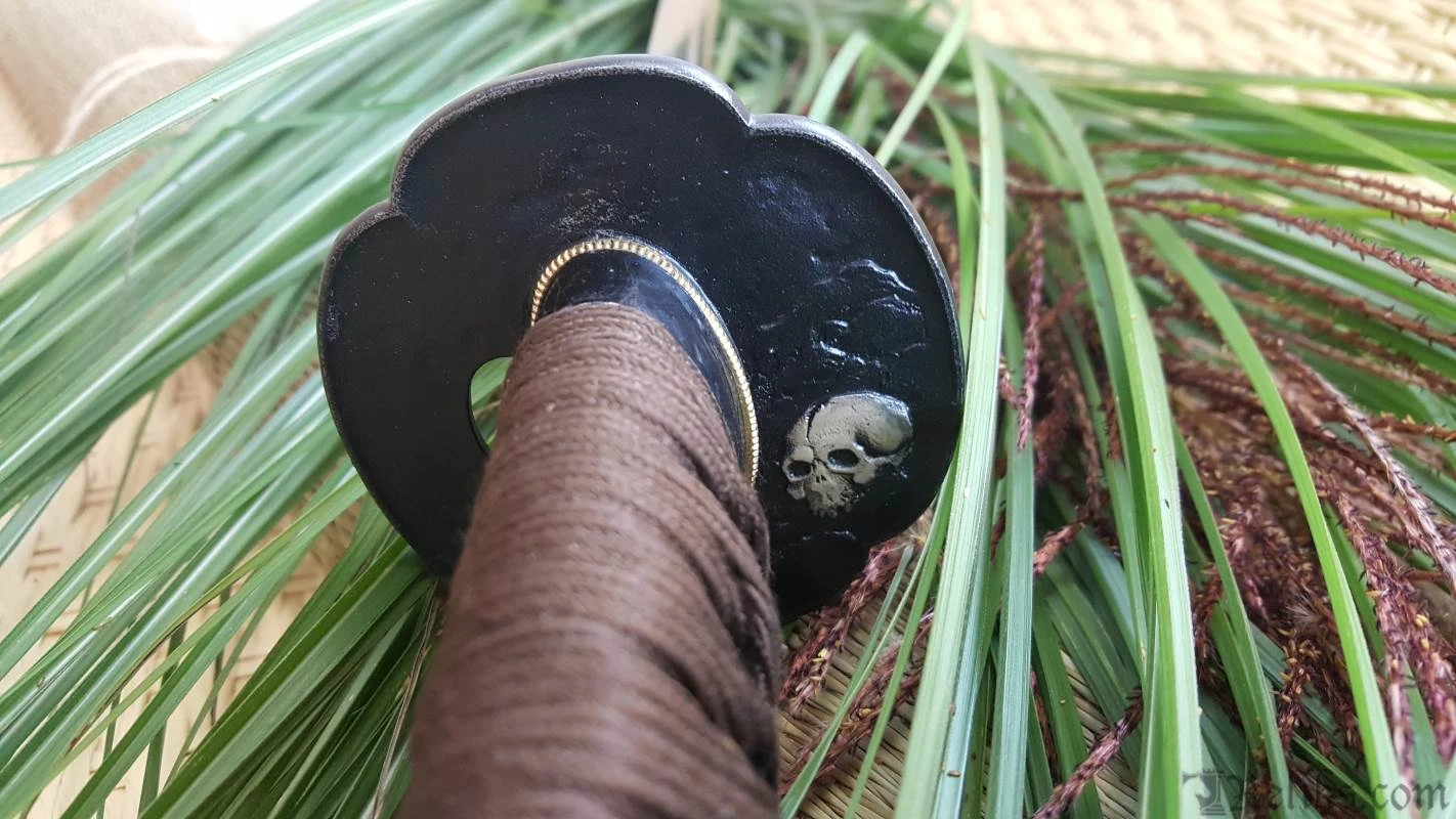 Keith then started in on the design of the mounts. Here’s what Keith had to say about how he approached the project. “Once I had decided on the Tadayoshi School katana as the starting point for this project I looked towards the general time frame that swords like these would be first used. I had recently been reading a book by the Japanese poet Basho and was decided to revisit an idea I had worked on before with a very high end custom mounting. This blade with it’s calm but deadly look evoked a feeling of the very nature of being a warrior. The good things, the bad things, and then the fact that life continues on even after the battle is done. And given the number of friends of mine currently serving in the military giving their all I wanted to do something to remind people of their work and their sacrifice.”The Basho poem is often called “Summer Grasses”. It reads “Natsukusa ya tsuwamamono-domo ga yume no ato”. Or loosely translated “Summer grass: where the warriors used to dream”. (Basho, translated by Hiroaki Sato, Basho’s Narrow Road. Berkeley, CA: Stone Bridge Press, 1996. Page 87.) Keith explains the poem this way.”The haiku was written when Basho visited an area that used to be occupied. The story goes that a number of loyal samurai were left there to defend the area and were wiped out in battle. Over time the area was abandoned and nature reclaimed the fields. The poem evokes both the feeling that the samurai who were there would have spent their time thinking and dreaming in this lovely area. They are warriors but they are also sons, fathers, brothers and friends and they would have had the same dreams as anyone else. But now, after their death, all that remained of those samurai and their dreams were the summer grasses now taking over the land. So dreams, lost dreams, the passage of time, but also the ongoing cycle of life. I find the poem by Basho can evoke a number of feelings in me on many different levels. So I decided the sword design should also carry that idea of trying to represent the varied levels of meaning. The mokko raised rim tsuba was designed to show the original field with a single bleached skull on the ground. The mokko shape was chosen as many practitioners like the fact that the sword doesn’t tend to “roll around” when placing the sword down on the mat when preparing or finishing practice. Keith wanted there to be something to show the reality of battle and war. Tsuba with these sorts of designs were appealing to the samurai. One had to accept the invevitability of death in order to transcend the fear of it. The higo style iron fuchi kashira and kojiri were designed with a background of the same field but with the classical higo design element. No skulls here — just the ground field and grass on the fuchi with the sky represented in a subtle fashion in classical higo style fittings. Higo style brown silk ito was chosen for the wrap with the typical higo blackened samekawa. The menuki chosen were single gold horses. Keith wanted to show the horses running free without saddles or other samurai gear to help show the idea of the horses returning to the wild after a chaotic battle. Finally the black gloss saya (scabbard) shows the summer grasses starting to grow. They are hand brushed in gold paint and gradually increase in frequency towards the iron kojiri but never overpower the simple black gloss saya. The custom made sageo (cord on the saya) is black and gold with gold grasses woven into the sageo, carrying the theme. Keith was adamant that the saya be a bit thinner from side to side than most production saya as he feels they are too bulky. He also had the kurigata placed closer to the koiguchi to ensure a robust sayabiki for practicing martial artists. The dimensions on the saya are more like antique saya than modern production saya in these ways. “Today there are more and more swords on the market. Most, however, most seem to miss the subtle details that differentiate a decent reproduction sword from something that really is a faithful representation of what these things really used to be. I wanted this sword to be as faithful as possible, raising the bar even higher for Bugei’s Exclusive swords. I also wanted to avoid the “flash” and gaudy look that seems to overtake so many swords. I went with an understated, old look because I wanted this sword to look like a it could have been picked up in that field of summer grasses all those years ago,” states Keith.