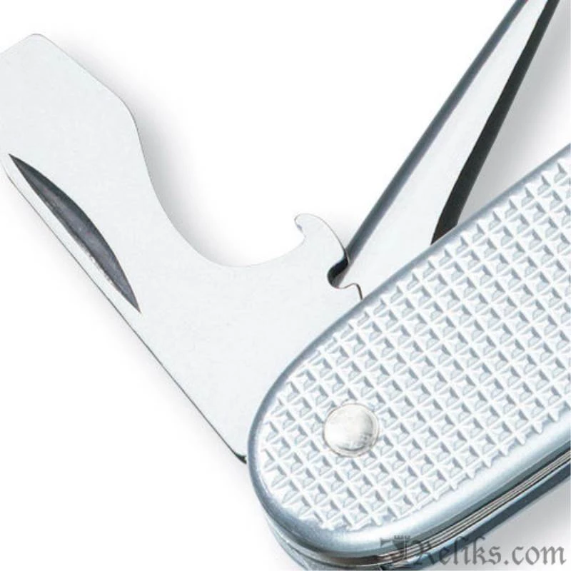 Features include: Large blade, Reamer, Can opener with small screwdriver, Bottle opener with large screwdriver & wire stripper, Engraving panel on back, Silver alox ribbed and Key ring.