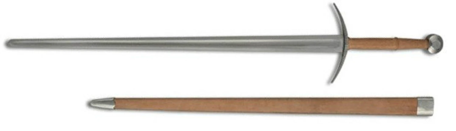 By customer request Hanwei has produced the Practical Bastard Sword, a re-enactment version of the popular Bastard sword. The blade is forged in 5160 high carbon steel, to minimize burring, and the transverse thickness of the guard has been increased, both to provide adequate strength for re-enactment use and to present a safer profile at the ends of the guard. Another innovation is the provision of an all-leather scabbard, in contrast with the rigid scabbards normally provided with the Practical swords – this is designed both to provide an extra margin of safety when combatants fall on the scabbard in battle and also to minimize the need for replacement scabbards. The Practical Bastard Sword is supplied with the grip and scabbard in a neutral-colored leather to allow customization to the owners taste.