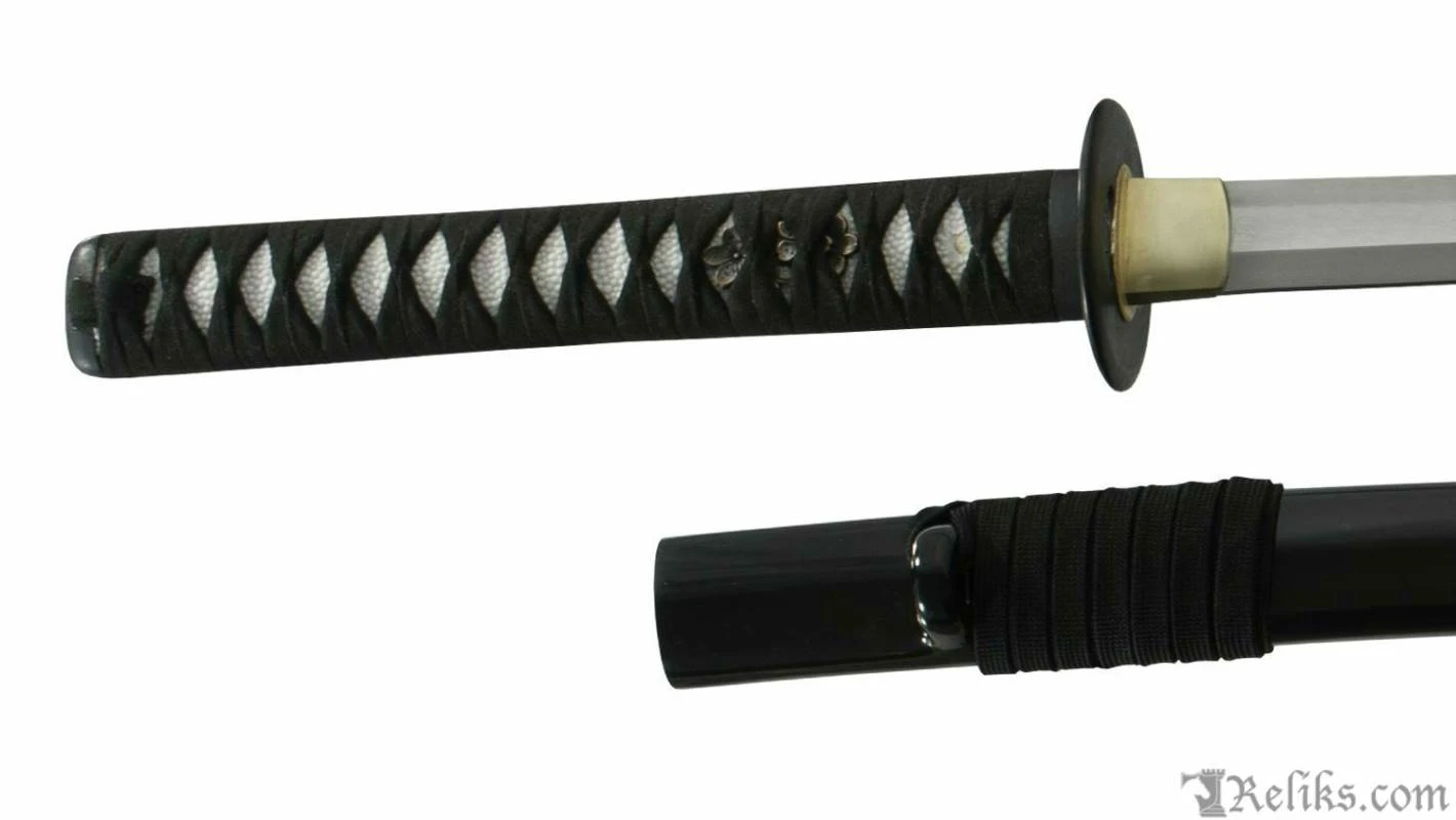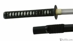 The blade is forged and differentially tempered, using the same process as the more expensive blades and producing an RC60 edge and RC40 back. The temper line and hamon are authentic and prominent. Cost savings are are found by using simple furnishings and fittings which make no claims to authenticity, but are very strongly built to withstand the rigours of cutting exercises. The samegawa has been replaced with a less expensive synthetic with no affect to the gripping ability of the tsuka-ito