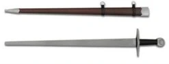 The Practical Knightly Sword is based on authentically styled swords in our collection but is tailored to meet the needs of re-enactment and stage combat. This very popular and affordable weapon features authentic hilt styling, with fully tempered un-edged and un-pointed blade. It is designed to withstand rugged use while providing the level of safety required by many of todays re-enactment societies. The blade is crafted from 1065 high-carbon steel, hardened to 50HRC, which restricts edge-notching to acceptable levels while providing resilience and protection against brittleness. While the blade is substantial, it is #fullered to provide balance and good handling characteristics. This sword features 1/16” wide edges and rounded tip for safety. The tang is also substantial, with radiused corners at the blade shoulders and no welds. The end of the tang is riveted over the pommel, which both eliminates any possibility of inadvertent disassembly and provides a traditional means of tightening a loose hilt. The hardwood grip has been leather-covered. The scabbard is fabricated in glass-filled resin, to provide great impact resistance, to eliminate swelling and to minimize blade corrosion problems. The scabbard now features belt rings that adjust to allow vertical or horizontal carry. The wood-grain finish is attractive, but most re-enactors will decorate the scabbard to match their persona.