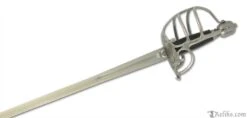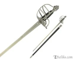 The Practical Mortuary Hilt Sword is built for the re-enactor. The basket is identical to that of the Mortuary Hilt Sword but the blade is unsharpened, with 1/16” edged and a rounded tip, complying with the combat rules of many re-enactment societies. Features authentic styling which is great for re-enactors. The blade is crafted in 1065 high-carbon steel, hardened to 50HRC, which reduces edge-notching to acceptable levels while providing resilience and protection against brittleness.