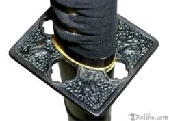 The Practical Shinobi Ninja-to, whose construction patterns closely that of the Practical Katana, is a wonderful addition for those studying the Way of the Ninja. The blade is made of hand-forged high-carbon steel and is differentially tempered using a traditional claying method. All the fittings (koshirae) are done in antiqued black iron. The ornate tsuba displays the kuji-kiri (energy-channeling hand positions) employed by the mystical ninja. The tsuka is wrapped in a synthetic ray skin and the tsuka-ito is done in imitation black leather. The saya has a black finish with demon-head bindings for the black Japanese cotton sageo and an intricate kojiri on the end of the saya. A sword no practitioner of Ninjutsu should be without.