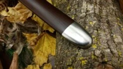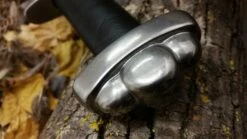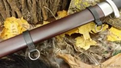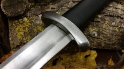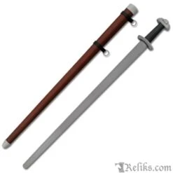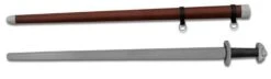 The Practical Viking Sword is based on authentically styled swords in our collection but is tailored to meet the needs of re-enactment and stage combat. This very popular and affordable weapon features authentic hilt styling, with fully tempered un-edged and un-pointed blade. It is designed to withstand rugged use while providing the level of safety required by many of todays re-enactment societies. The blade is crafted from 1065 high-carbon steel, hardened to 50HRC, which restricts edge-notching to acceptable levels while providing resilience and protection against brittleness. While the blade is substantial, it is #fullered to provide balance and good handling characteristics. This sword features 1/16” wide edges and rounded tip for safety. The tang is also substantial, with radiused corners at the blade shoulders and no welds. The end of the tang is riveted over the pommel, which both eliminates any possibility of inadvertent disassembly and provides a traditional means of tightening a loose hilt. The hardwood grip has been leather-covered. The scabbard is fabricated in glass-filled resin, to provide great impact resistance, to eliminate swelling and to minimize blade corrosion problems. The scabbard now features belt rings that adjust to allow vertical or horizontal carry. The wood-grain finish is attractive, but most re-enactors will decorate the scabbard to match their persona.