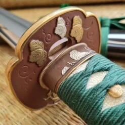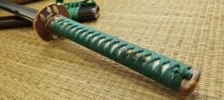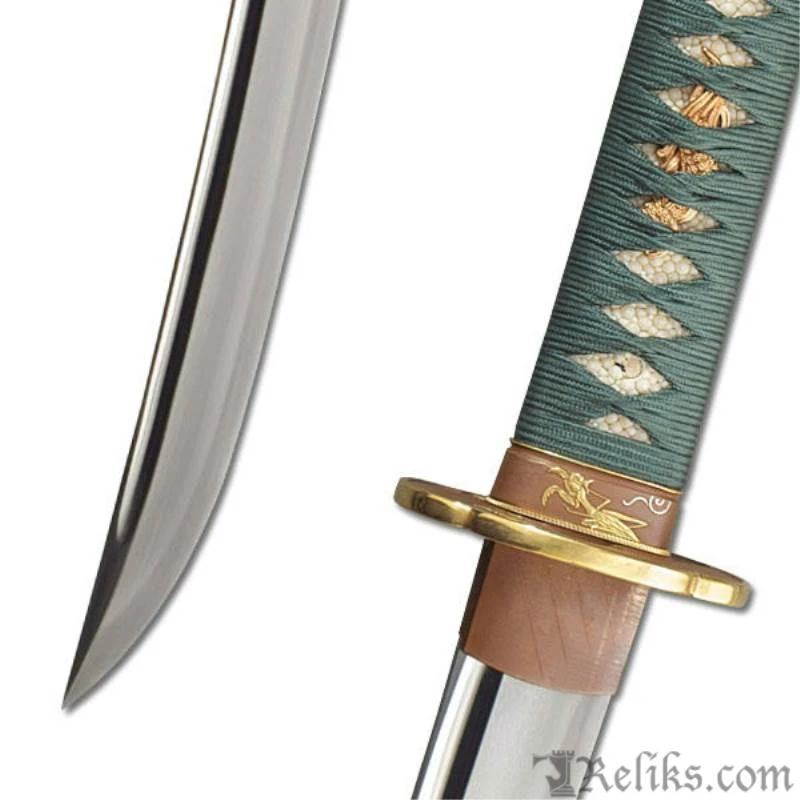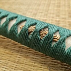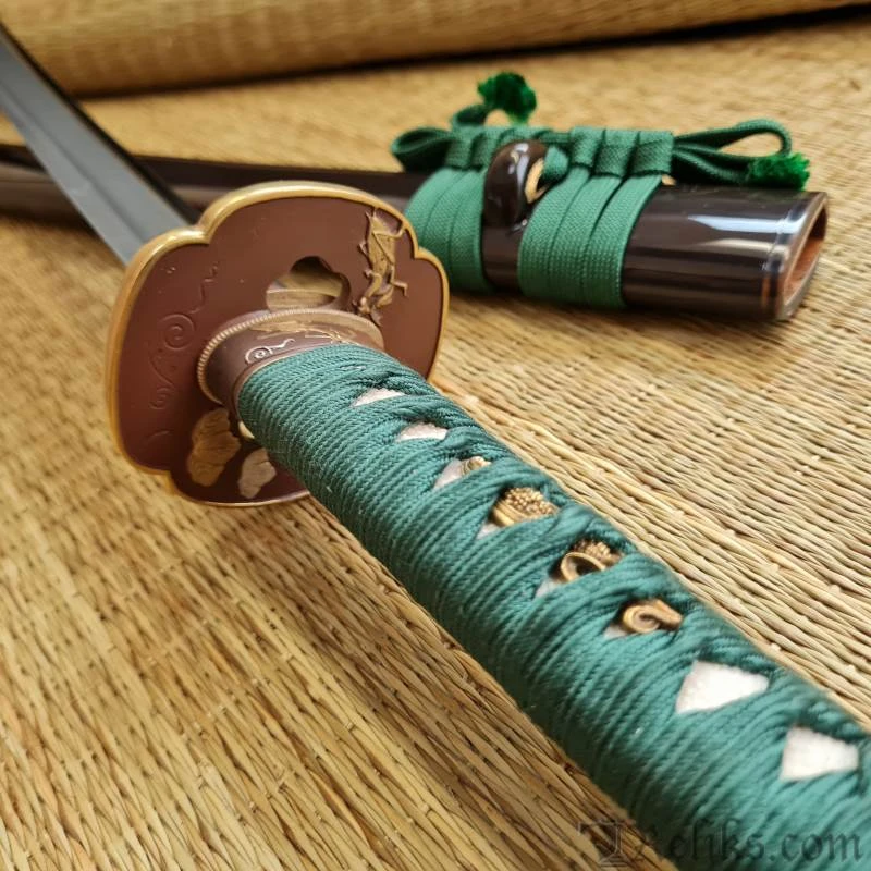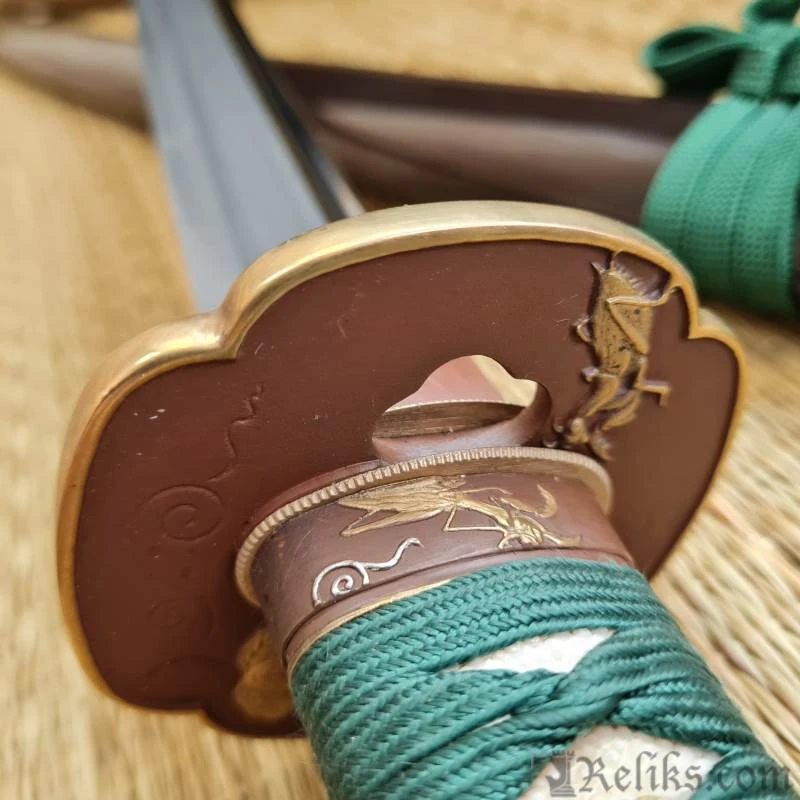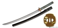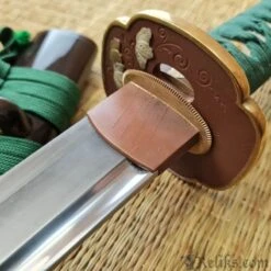 The Praying Mantis is a symbol of cunning and power in Japanese culture and is consequently a highly respected theme in Samurai swords. Built on our new L6/Bainite blade in the Shobu Zukuri style with bo-hi, and featuring superb koshirae, the Praying Mantis is a very desirable and functional piece. The subdued green silk ito and deep brown of the lacquered saya provide handsome contrast to the dark copper and golden accents of the tsuba, fuchi and kashira. The stalking mantis lies in wait for his next prey, mirroring the power and grace in this exceptional katana. Bainite is a structure of high-carbon steel that combines great strength with excellent flexibility and shock absorption characteristics. It has been known as an exemplary Katana blade component for a number of years but its use has been restricted to a few top-class master smiths, due to the difficulties involved in performing the exacting heat treatment procedures necessary for the production of a Bainite blade body in combination with the very hard Martensite Yakiba (edge section) required for Katana blades. Hanwei has now mastered this difficult process, using billets of L-6 tool steel (a very tough high-carbon low-alloy steel) as a starting point. Blades are forged and shaped in the normal way, then carefully heat treated to achieve the required Bainite and Martensite structures before final polishing.