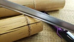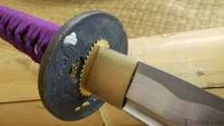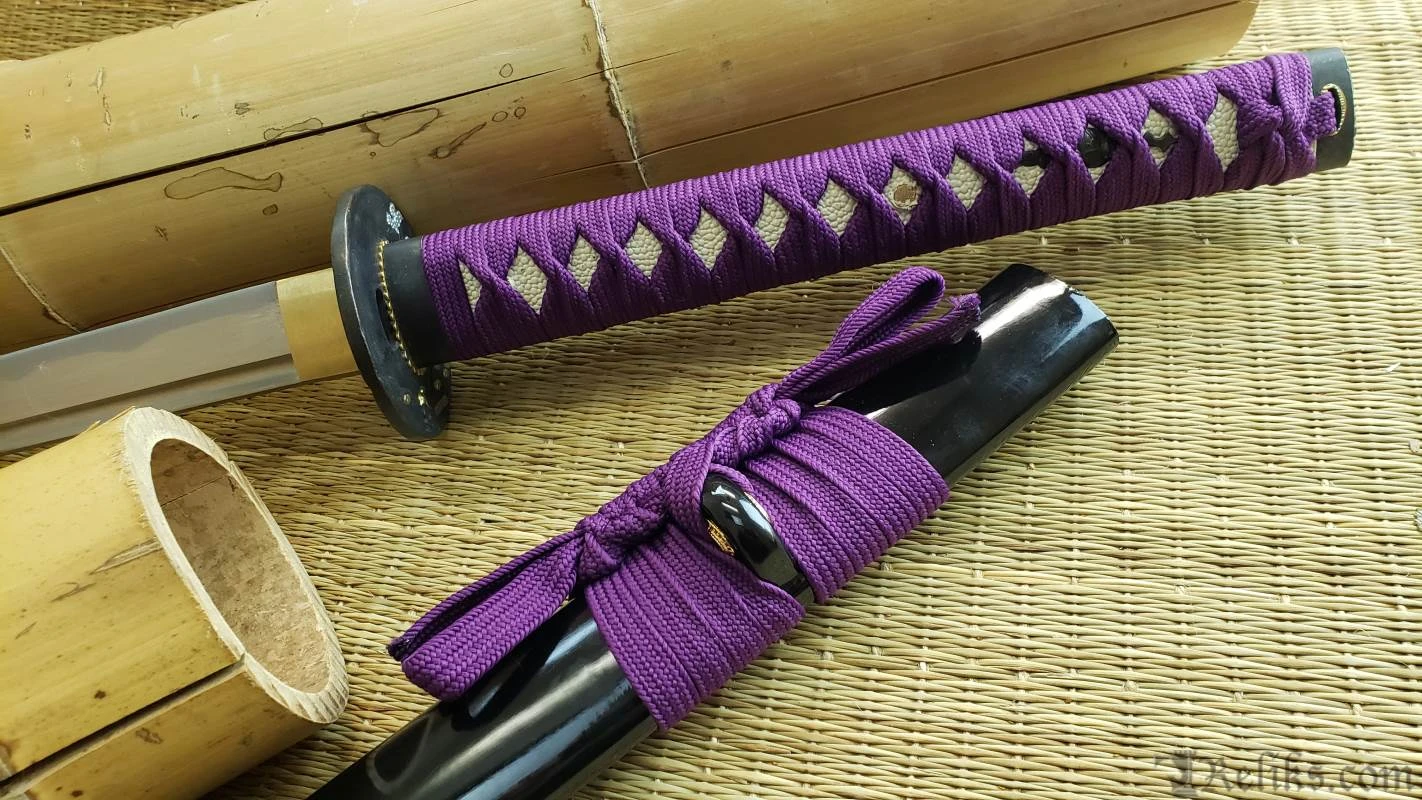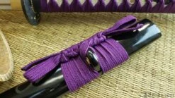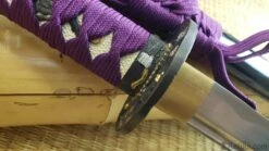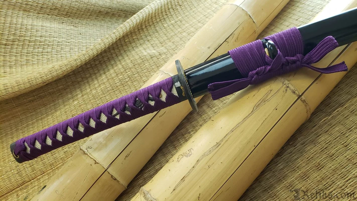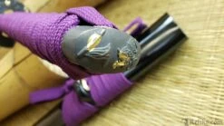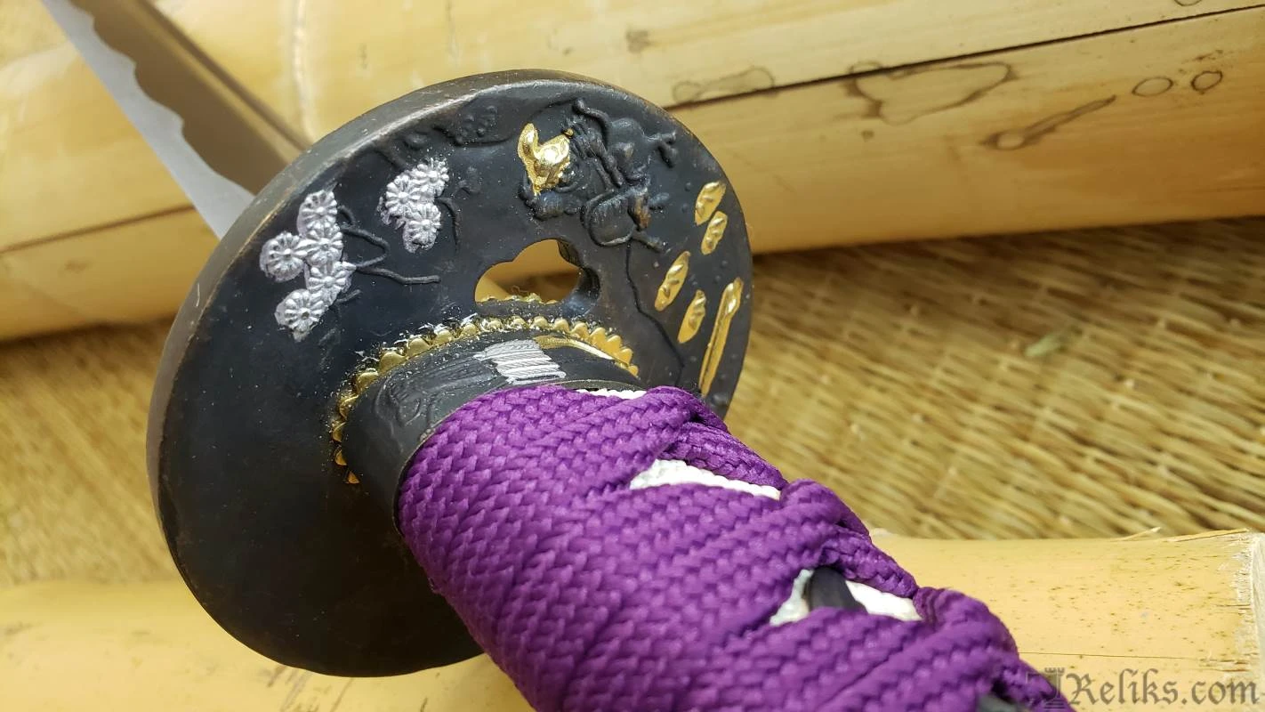 The Purple Samurai Warrior Katana is a starter katana adorned with images of the training of the Samurai. Traditionally, Samurai trained with the sword, bow, spear and naginata. While training, samurai would use wooden weapons for practice against each other, then sharp swords against dummies made of wood or straw. The rigorous training of a samurai warrior began in childhood. This beginners sword boasts upgraded fittings over other starter swords with more attention put to weight and balance. This beginner piece has a tempered high carbon steel blade, double pinned handle through a traditional length tang. With budget in mind this piece uses a 1045 high carbon steel which is a little softer than the higher end katana but is still suitable for soft targets like tatami and “pool noodles”. Includes a sword bag.