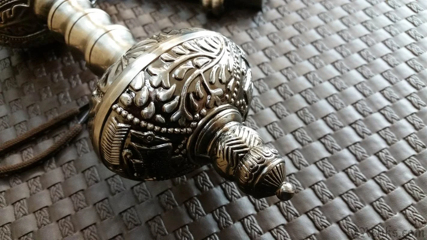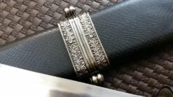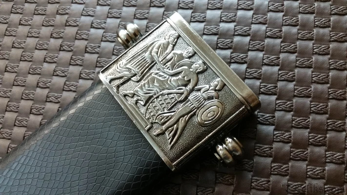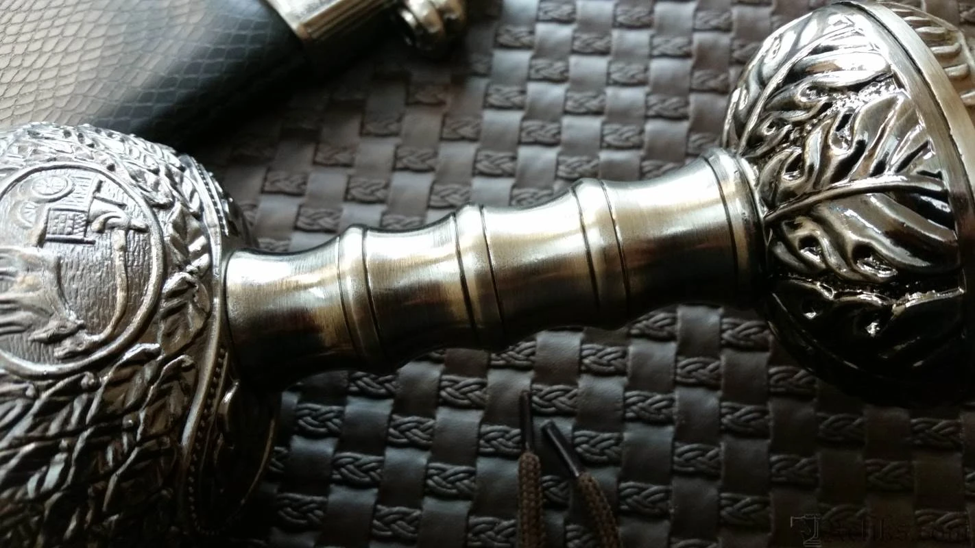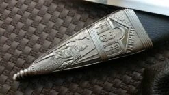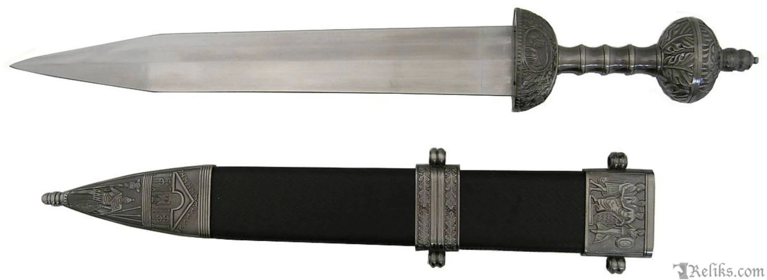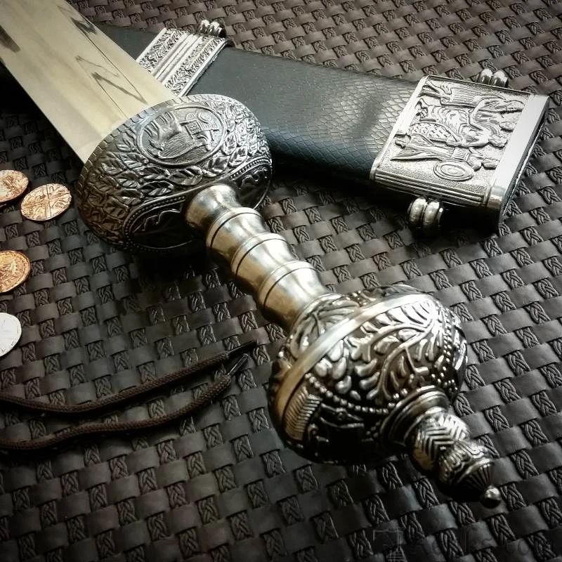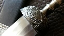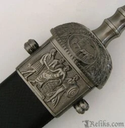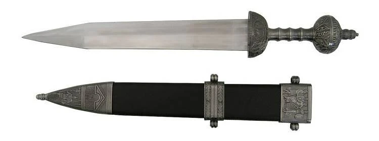 The Romans used a short sword because of the phalanx(pike) which prevented the use of longer swords. After breaking the defense of the phalanx it would then become a close combat. The Roman warrior would rush the enemy fighter and engage with all his attention at eye level while thrusting underhand with the sword. This version of the Roman sword is intricately detailed from the sculpted pommel down to the stainless steel blade. Overall length is 30″. The sheath is trimmed with sculpted Roman scenes.