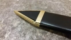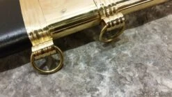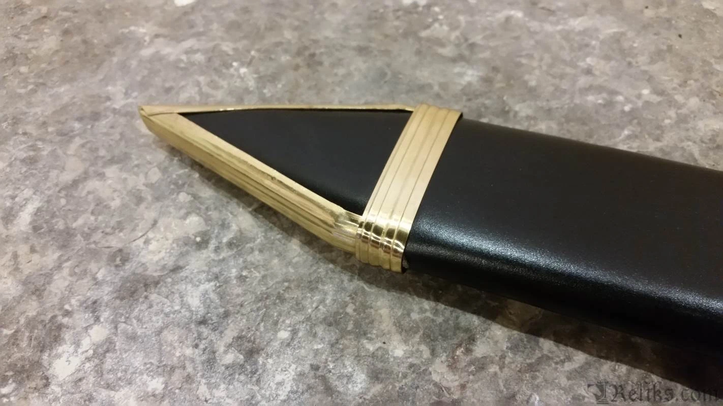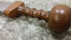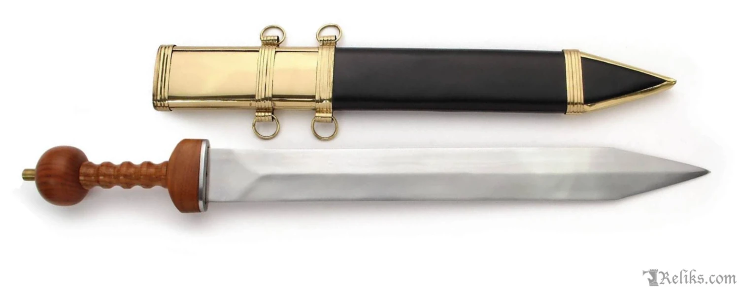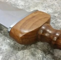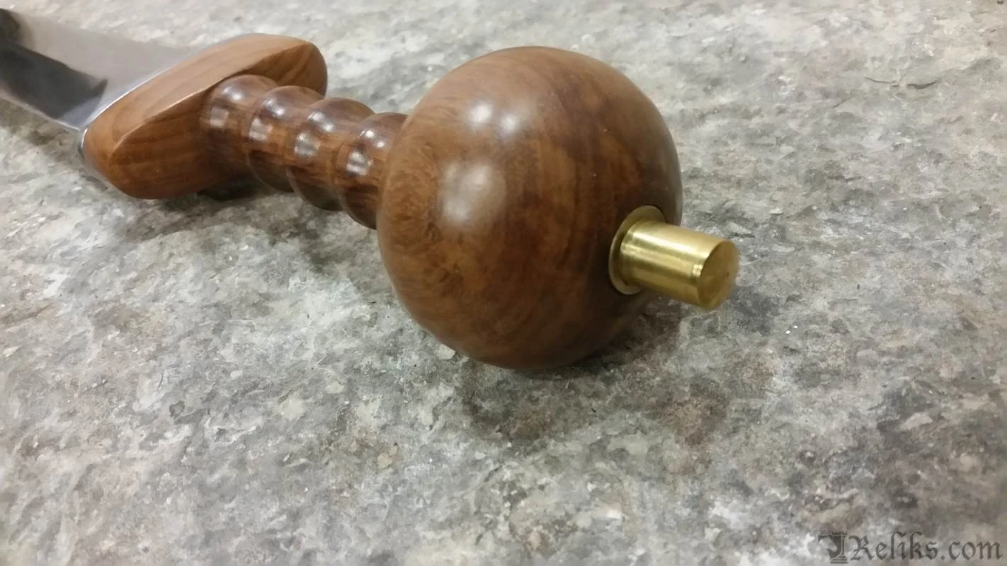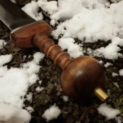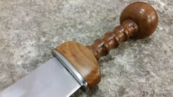 The Roman Military was a feared opponent due to it’s advanced formations that would quickly overwhelm an enemy force. One of the most effective use of a gladius was in formation behind the protection of a Roman shield wall. This type of later version gladius known as the Pompeii (circa 100) had a shorter point but were just as effective as the earlier “wasp wasted” blades and were easier and less expensive to make. Under the leadership and advanced tactics of the Roman legions this would become the sword that conquered most of the known world. The Pompeii has an ash and maple handle with a functional high carbon steel blade. The original Roman gladius were excavated from the ruins of Pompeii. You can see examples in H. Russell Robinson’s book “What The Soldiers Wore On Hadrian’s Wall.”