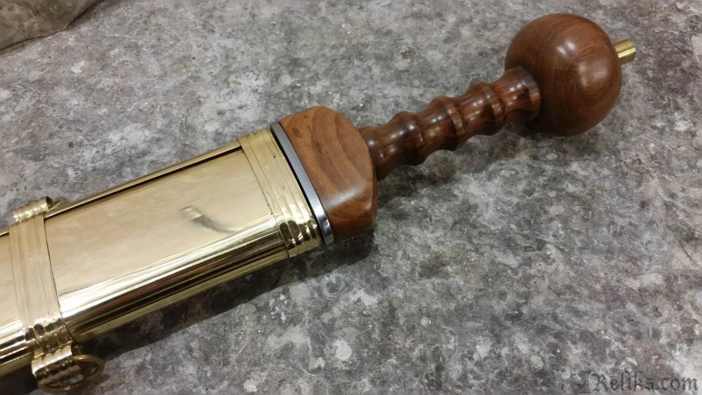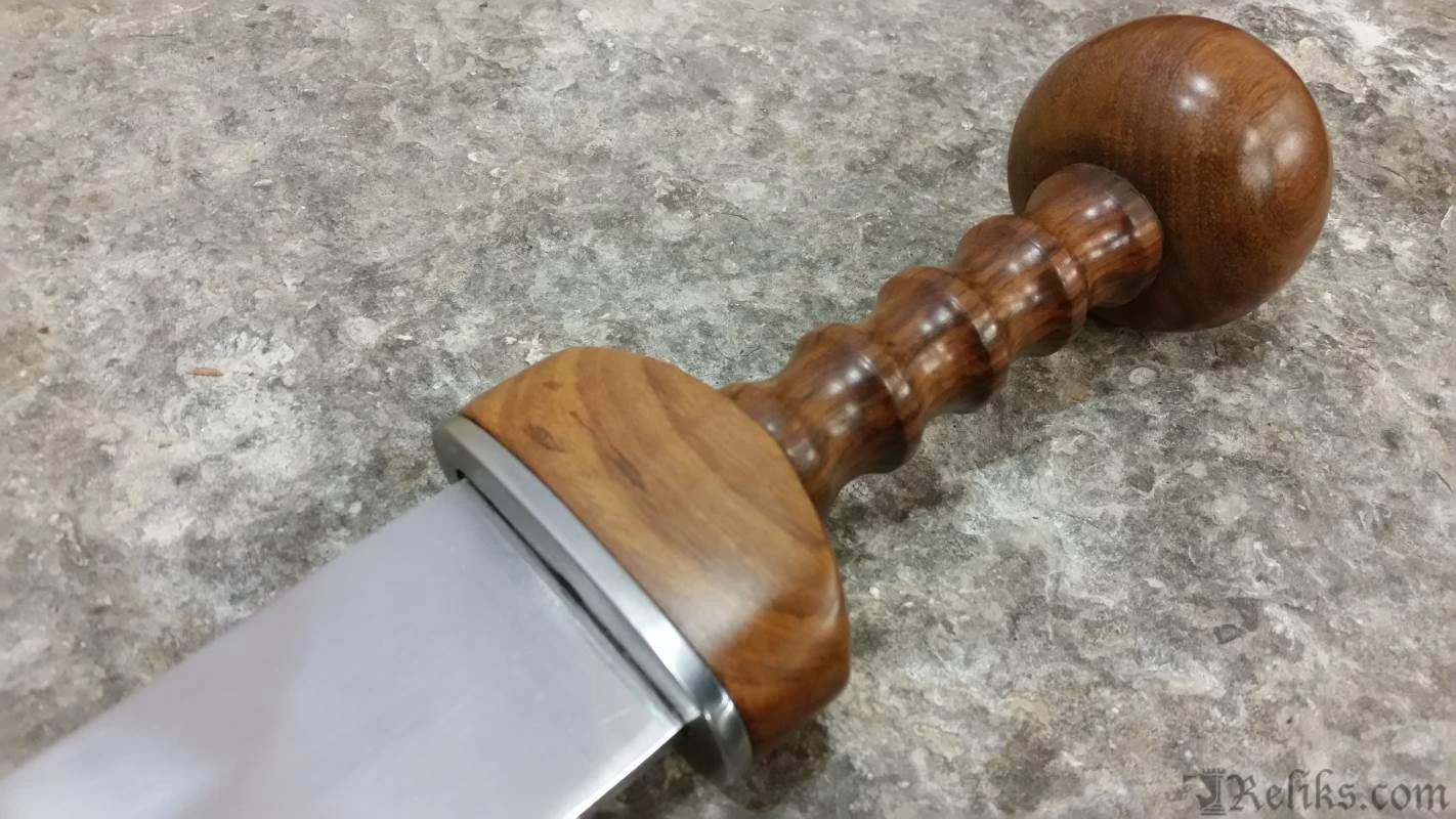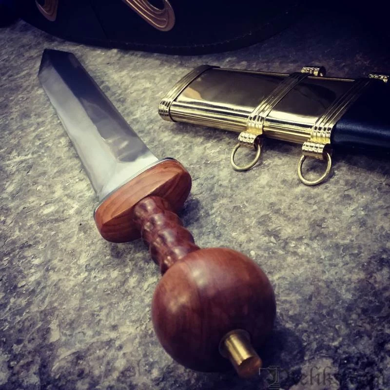 This sword hand forged from a billet of high carbon steel and has a diamond cross section meaning the blade is thicker in the middle and tapers to the edge. The raised centre increases the rigidity of the blade for thrusting however remains flexible enough to absorb the shock of the thrust or slash. The hilt is constructed using Ash and Maple wooden parts. The blade has a full tang that extends through the hilt and secured with a pommel button. Read more about “The Sword of the Roman Army”