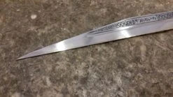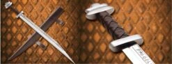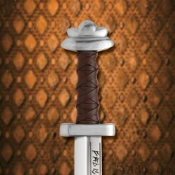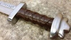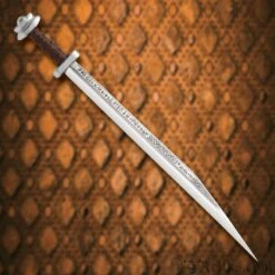Back by popular demand is this Viking seax, whose long blade is decorated with letters of the runic alphabet. The Vikings believed that runes possessed magical power and often inscribed them into blades to increase power. Copied from one on display at the British Museum. Leather-wrapped handle gives you a firm grip on this surprisingly light and quick weapon. Comes with a brown leather scabbard and two back-belt hanging straps. Made by Windlass Steelcrafts and comes factory sharp.