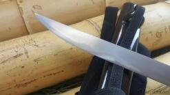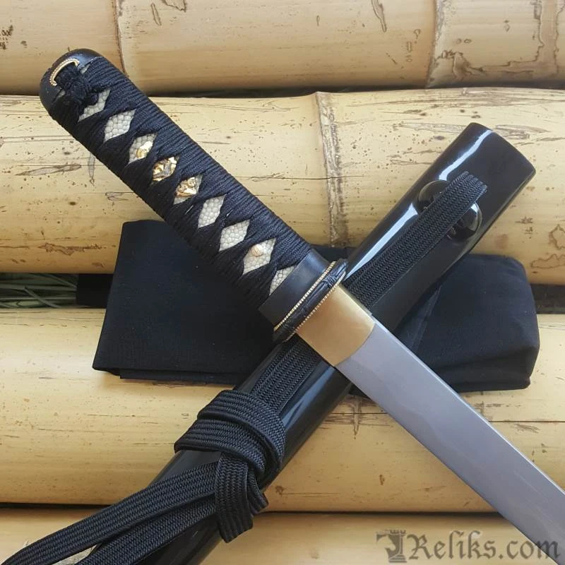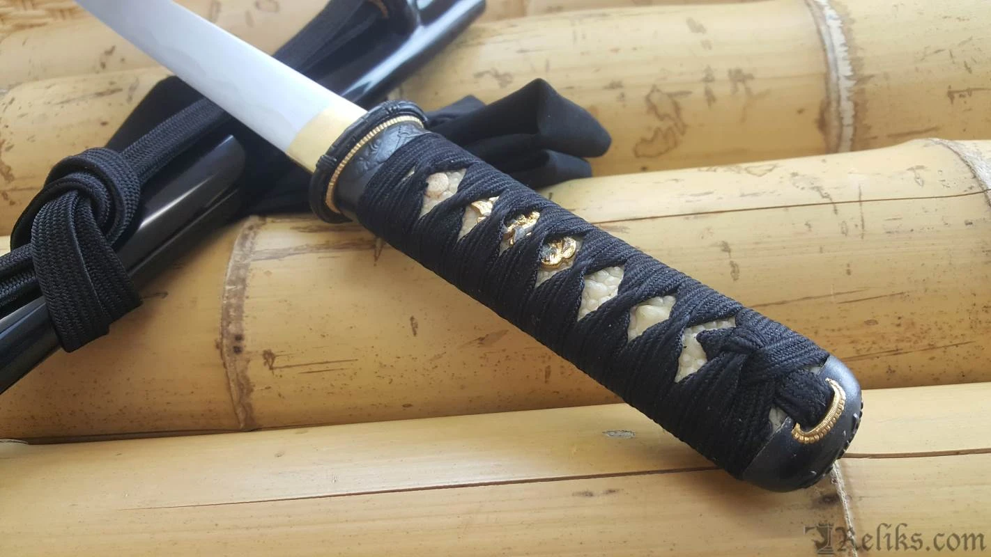 The Samurai Tanto is a great companion piece to the Bugei Samurai Katana. Made in the same tradition and high quality materials as the katana, this tanto performs in superior functionality and grace. The Samurai Tanto is one of the strongest and best performing Japanese style tanto blade ever offered at this price. Strength, edge holding, and beauty have all been significantly enhanced by the use of the powder steel along with the complex folding process. The overall motif mirrors that of the katana and would make a beautiful addition for the collector or the practitioner. The hamon (temper line) and hada (grain/layers) on this forged and folded steel tanto blade are prominent in the polish.