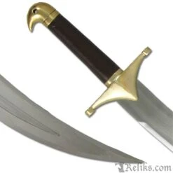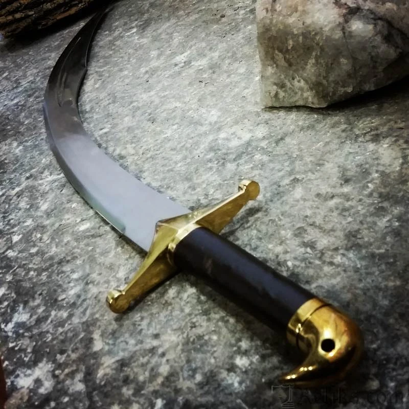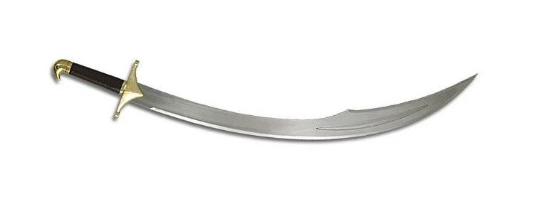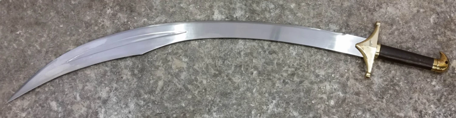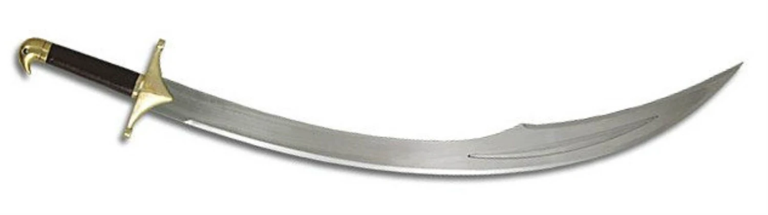 The deeply curved blade of the Scimitar recalls battles between the Saracen and Crusader. The curved wide blade of the later Persian scimitar could deliver powerful unstoppable slashes due to the long cutting edge, deep curve and heavy forward pulling tip. The variation of “shamshir” could be used effectively by infantry as well as deliver even more powerful blows when delivered from horseback. As well as being an effective sword its perfect centre balance make this piece not only great for sword practitioners it is also and essential piece of equipment for traditional eastern dance.