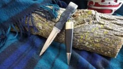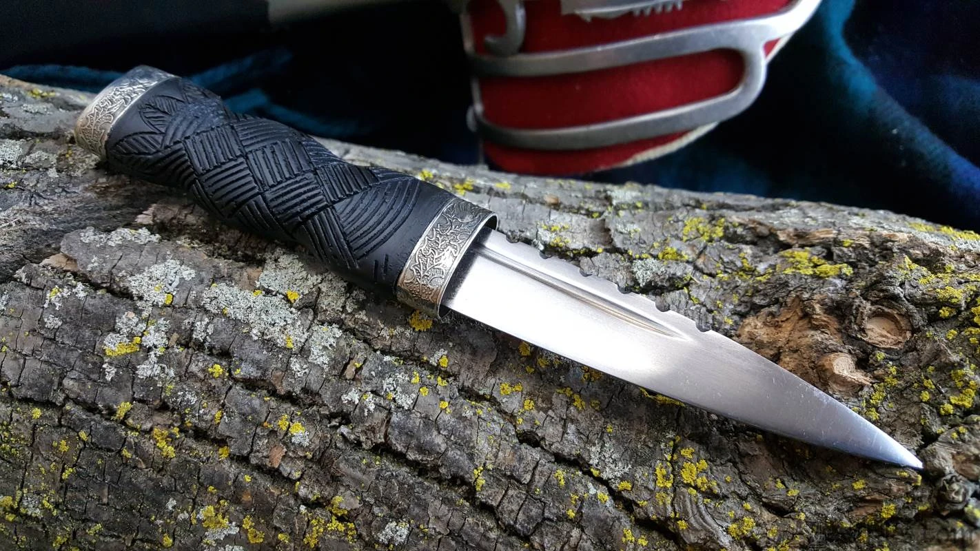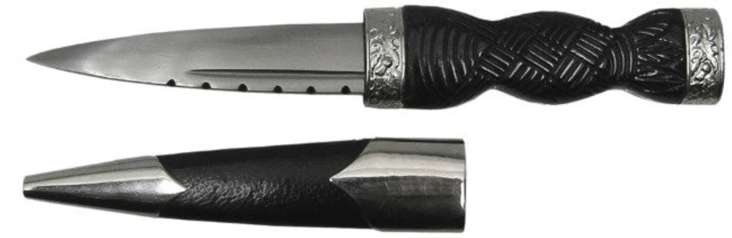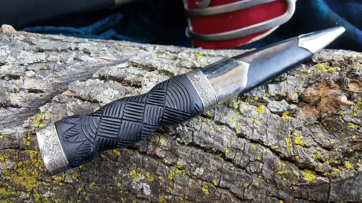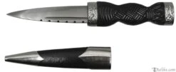 A Scottish tradition, the original Sgian Dubhs were frequently worn under the shirt close to the armpit. Now it is traditional for the Sgian Dubh to be worn in the stocking of the Highlander, and the knife is frequently called a “stocking dirk”. The term “Sgian Dubh” itself actually means black handled knife. Our forged carbon steel Sgian Dubh which weighs less than 2 oz., has a black wooden handle that is carved on one side, smooth on the other. Embossed nickel silver fittings feature a thistle motif. Comes with sheath. Made by Windlass Steelcrafts and comes factory sharp.