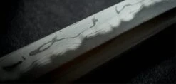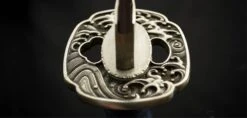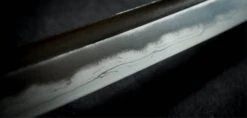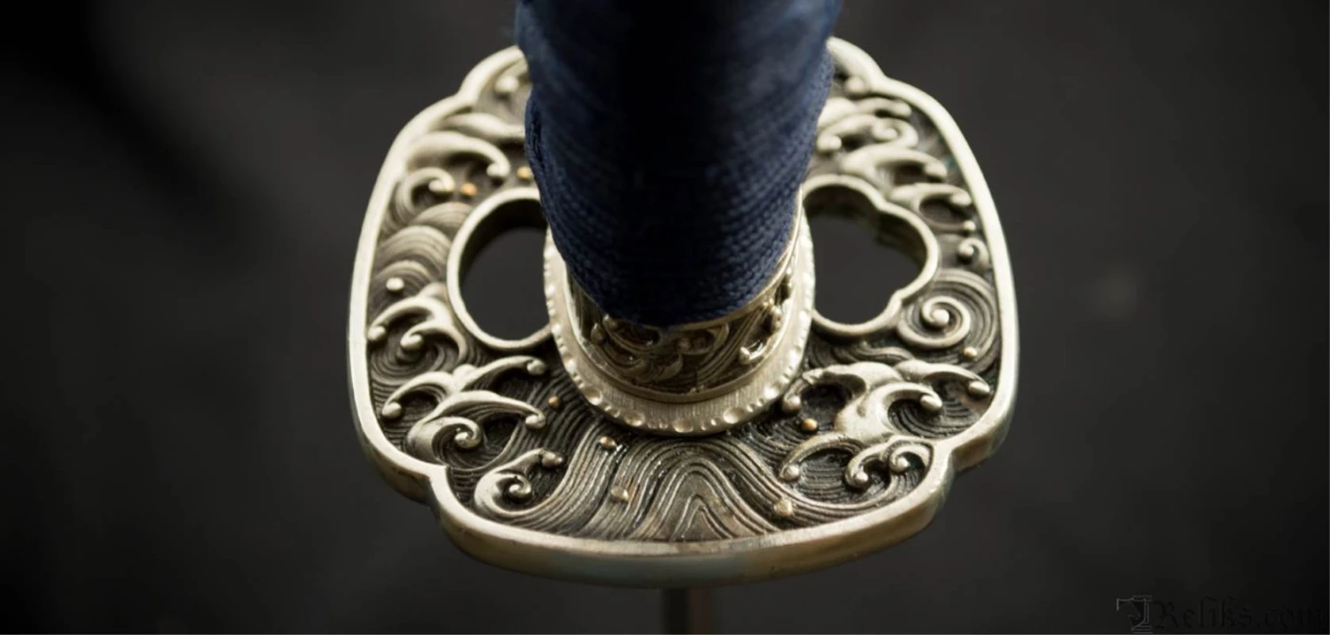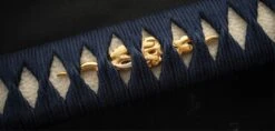 Sea waves are unique in the duality of their existence. They are fleeting yet eternal with their ebb and flow. The sound of sea waves can invoke a serene calmness and relaxation or fear and mortal dread when violently stirred. In medieval Japan the “katana” was symbol of peace, power and order but when in the wrong hands could be used for chaos, death and destruction. The Sea Wave Katana from Dragon King embody similar dualities in their existence. The placid blue saya conceals a rippling folded steel blade featuring bo-hi (groove) collared by a silver hibaki and notched seppa. The hada and hamon mirror the silver turbulent waves depicted tsuba, kashira and fuchi. Silver and gold menuki contrast against the dark blue tsuka handle wrap overlaid white same (ray skin). A blue sageo complete the saya accented by buffalo horn kurikata and koiguchi. The Sea Wave Katana features another duality between being a formidable weapon and a work of art.