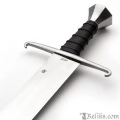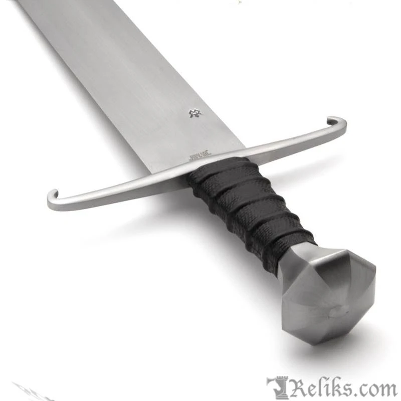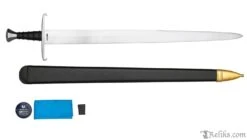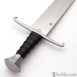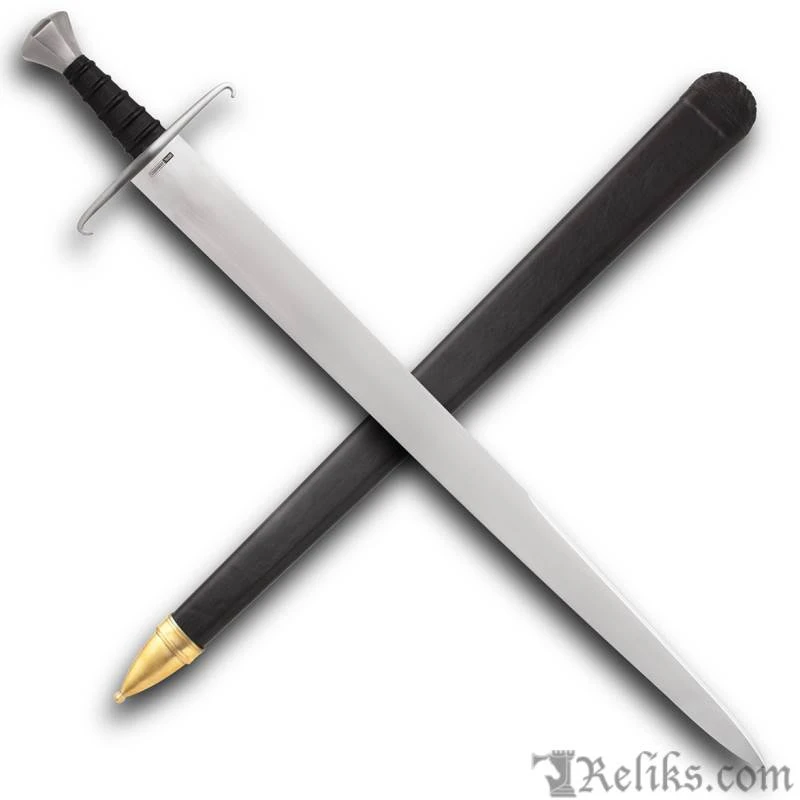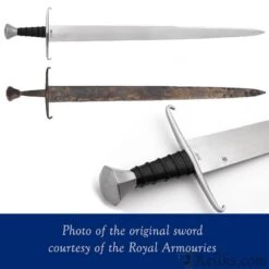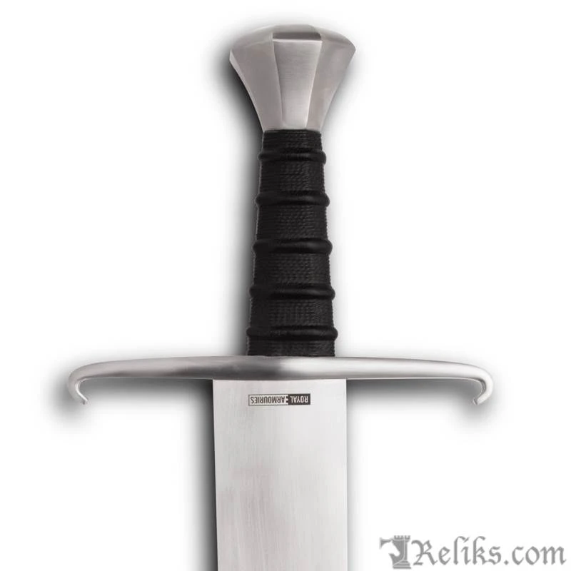 This replica is crafted with a hand-forged blade by an experienced, skilled blacksmith using modern 1080 high-carbon steel that is fully tempered and is distally tapered for proper weight distribution. The sheath is made with a wood body and covered with leather. The tip is reinforced with a brass chape that features ornate cut-outs and an acorn tip. At the throat, the leather extends upward and covers part of the guard at the ricasso. Includes a certificate of authenticity on heavy stock, a tin of Windlass Classic Wax, and a polishing cloth. Made by Windlass Steelcrafts, the original can be seen in the Royal Armouries Collection, Object Number IX.2638.