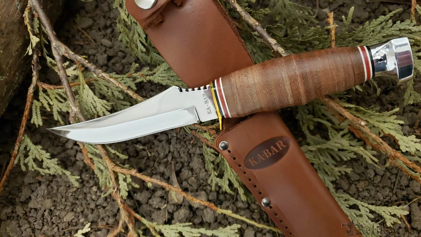 Dressy enough to give as a gift and practical for field use. Features a thumb ramp and stacked leather handle with finger grips, a brass guard and aluminum butt cap. Plastic lined leather sheath included.