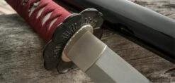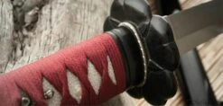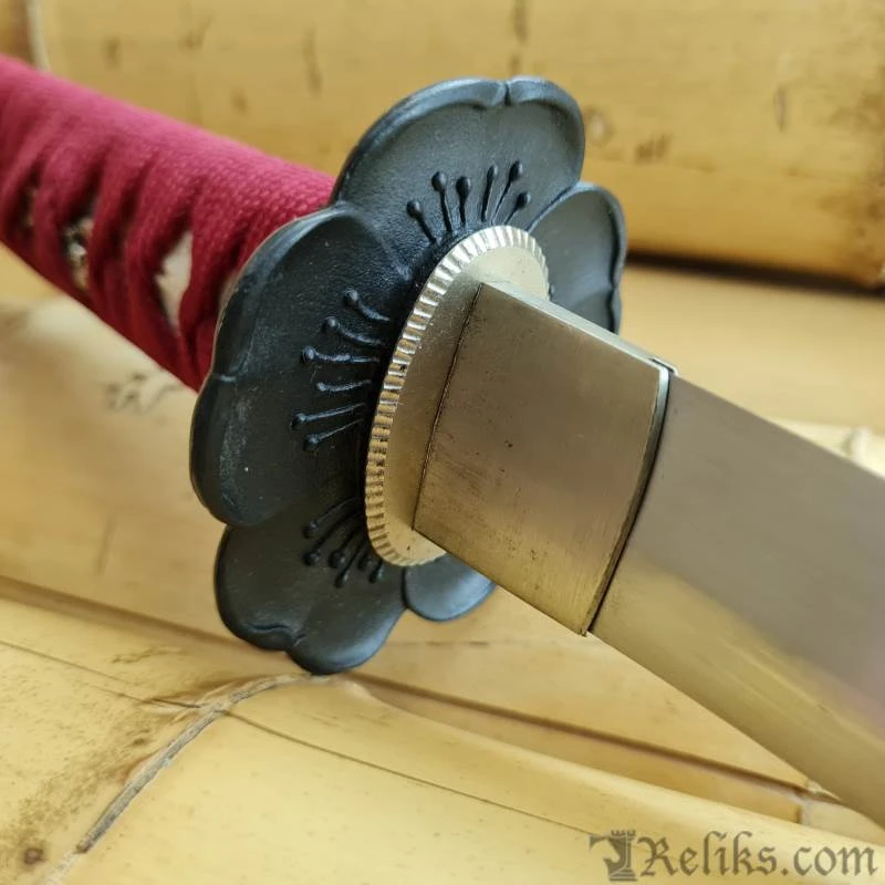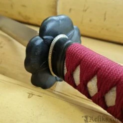 This sharpened katana is produced for the beginner to intermediate martial artist. It features a forgiving through-hardened 27″ blade. The 5160 forged high-carbon steel blade features a 1 ½” kissaki (point) and marquenched to an edge hardness of 57HRc with blade geometry conducive to rigorous cutting without chipping or deformation on soft and semi-hard targets. The blade furnishings include a blackened fuchi and kashira with an ornate stainless cherry blossom tsuba.