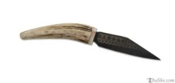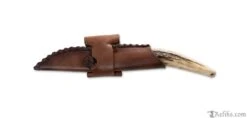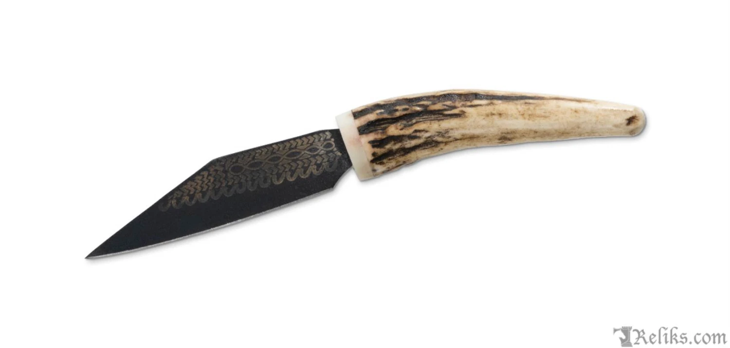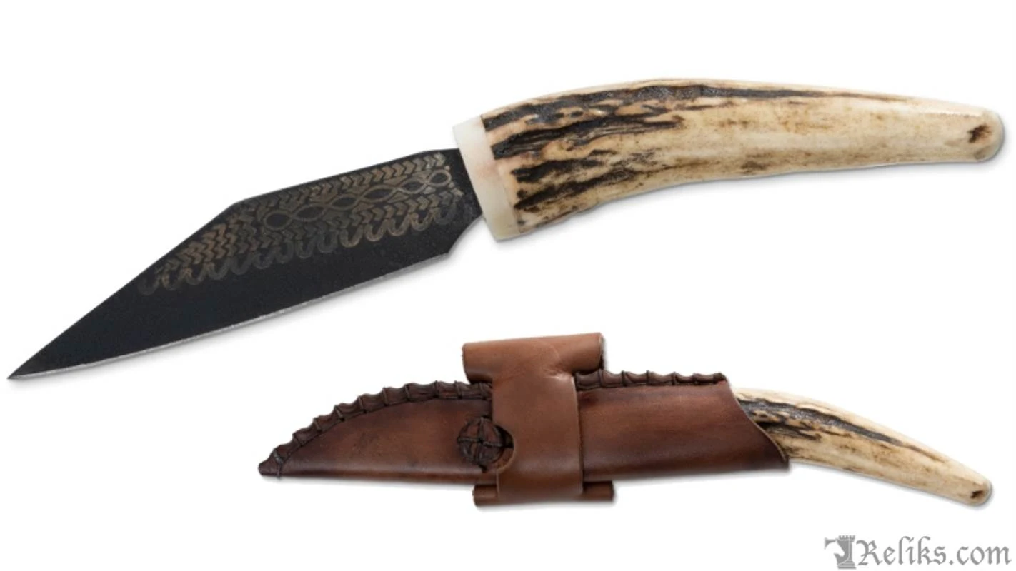 The Scramasax carried by the Saxons and the Vikings between the 4th and 10th centuries, came in a wide range of sizes and was used both as a tool and a weapon. Carried horizontally, at the back of the belt, the scramasax provided the spearman with both a close-quarters weapon and a tool and utensil in camp. Our Stag Scramasax, is patterned on a historical surviving blade and while these small scramasax would have been used primarily as eating utensils they could, if needed, be called upon to inflict a disabling wound. This small scramasax is authentically hilted in stag and is equipped with leather horizontal-carry sheaths.