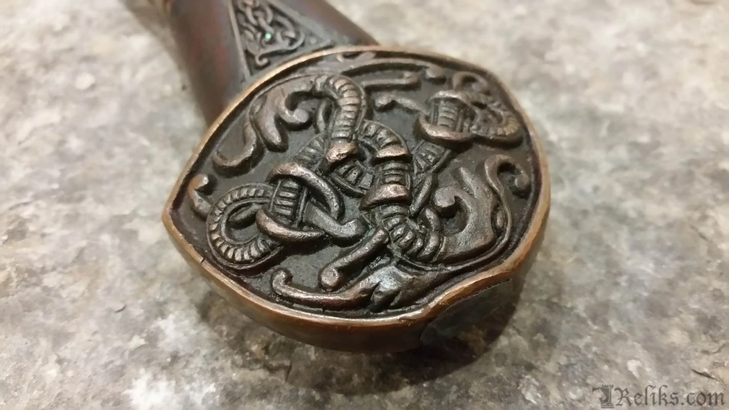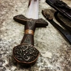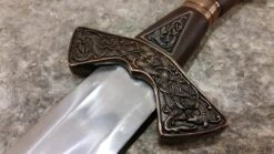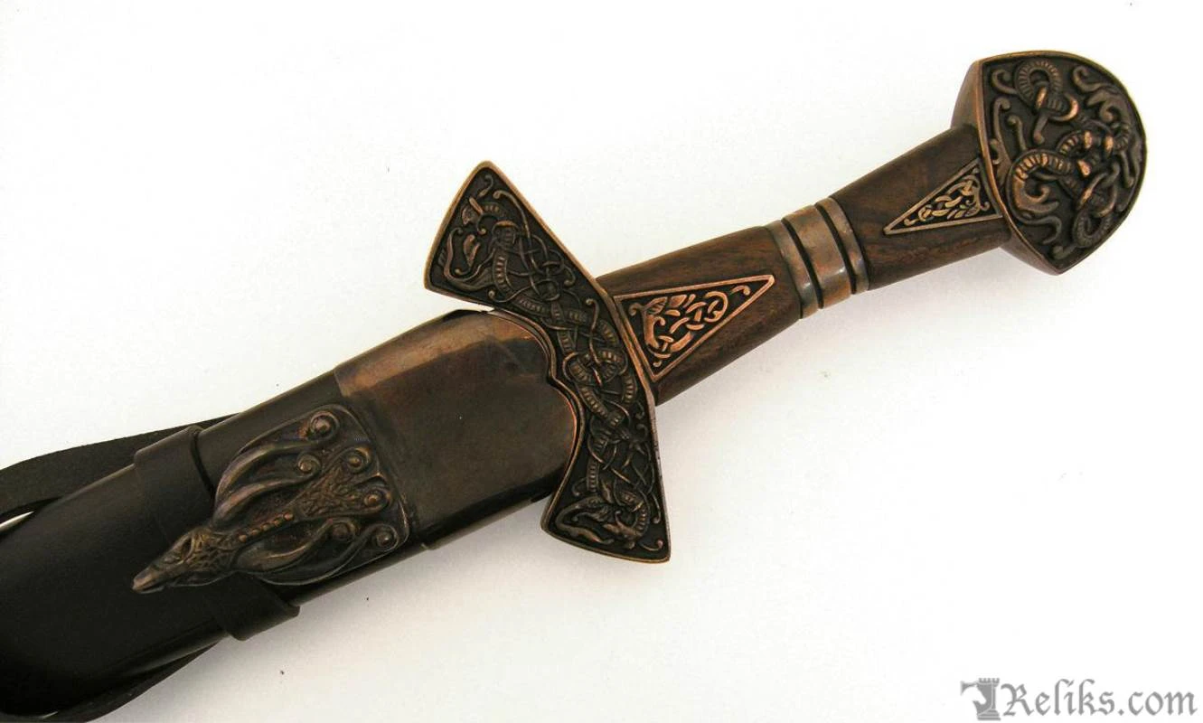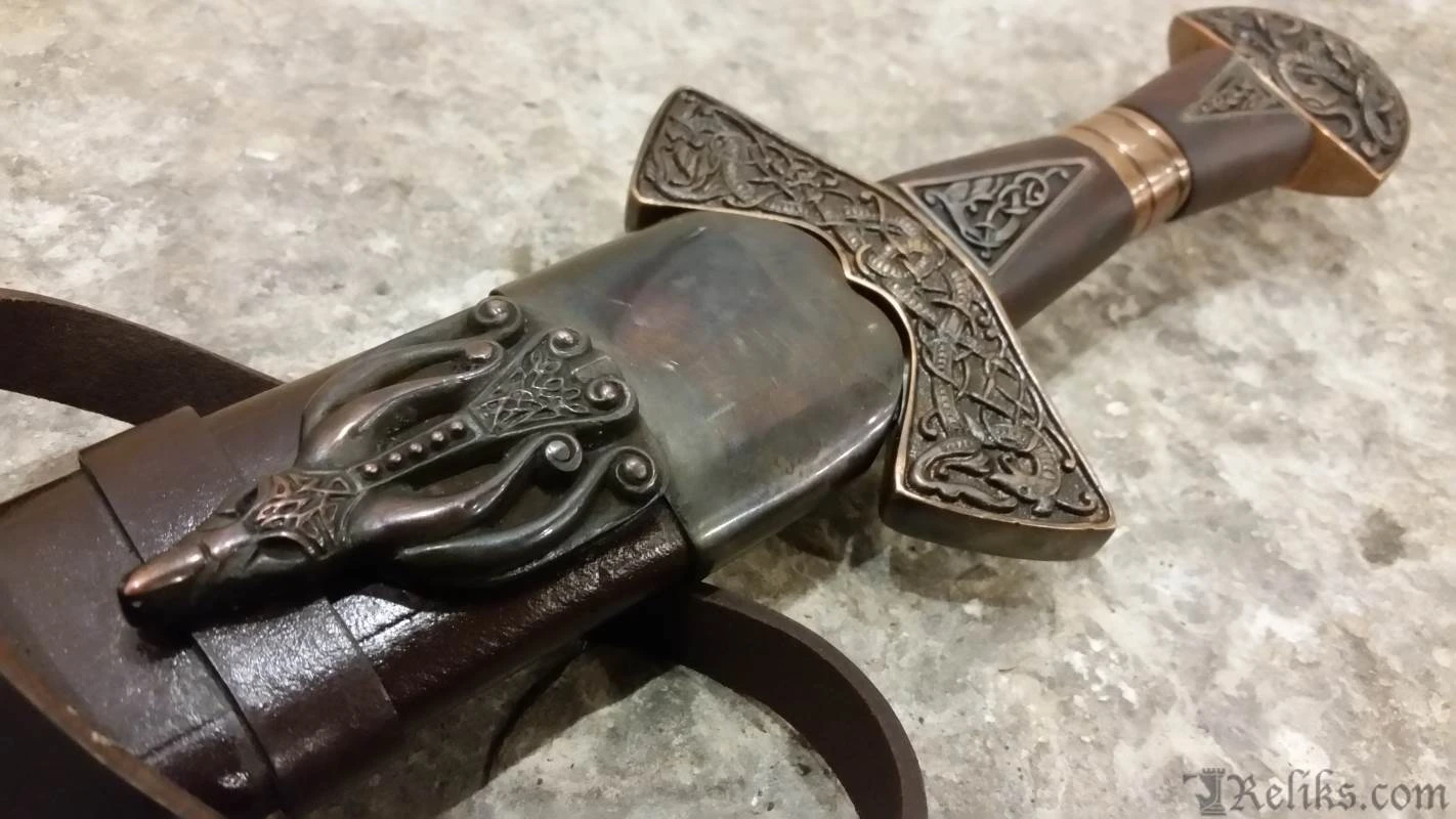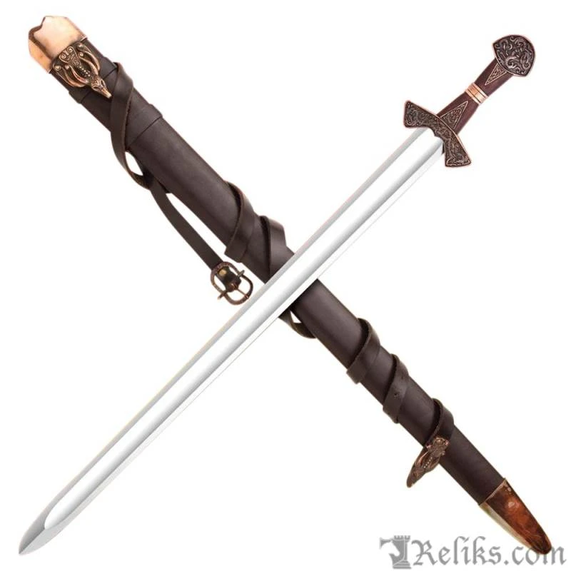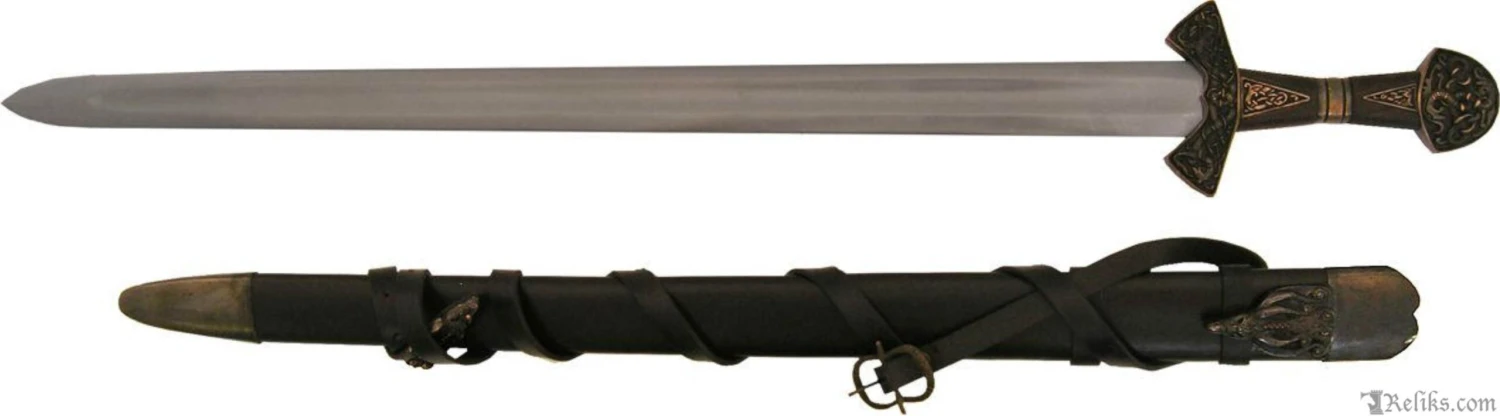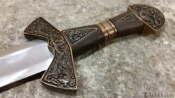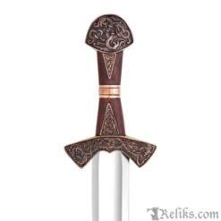This is a reproduction of the original Suontaka sword that was excavated from a woman’s grave in Finland. The grave was dated 1100AD, however the swords form itself suggests and earlier date of origin. It would not be unusual for a sword like this to be a family sword which had been buried with it’s final heir. This stunning version of the famous viking sword features a highly detailed knot work pattern throughout the pommel, guard and grip with additional bands and inserts. The sword comes complete with a rich leather scabbard and matching with equally detailed fittings while sporting a baldric for wearing this powerful sword. All of the sword and scabbard fittings have been lavishly plated in a rich copper.
