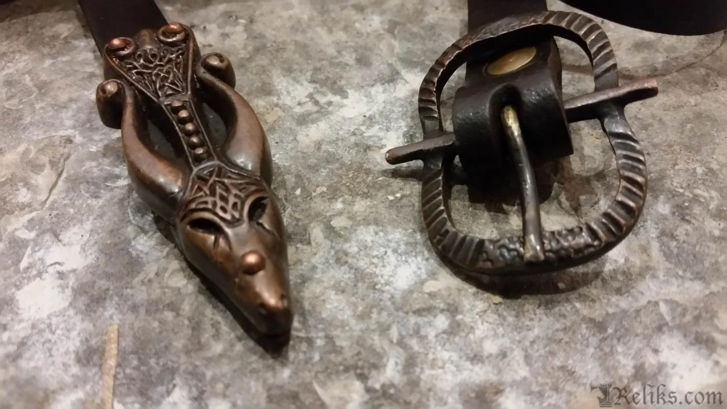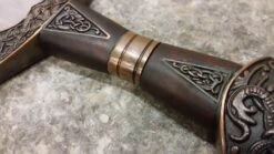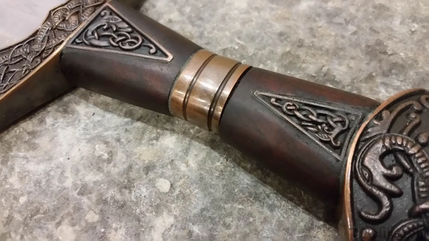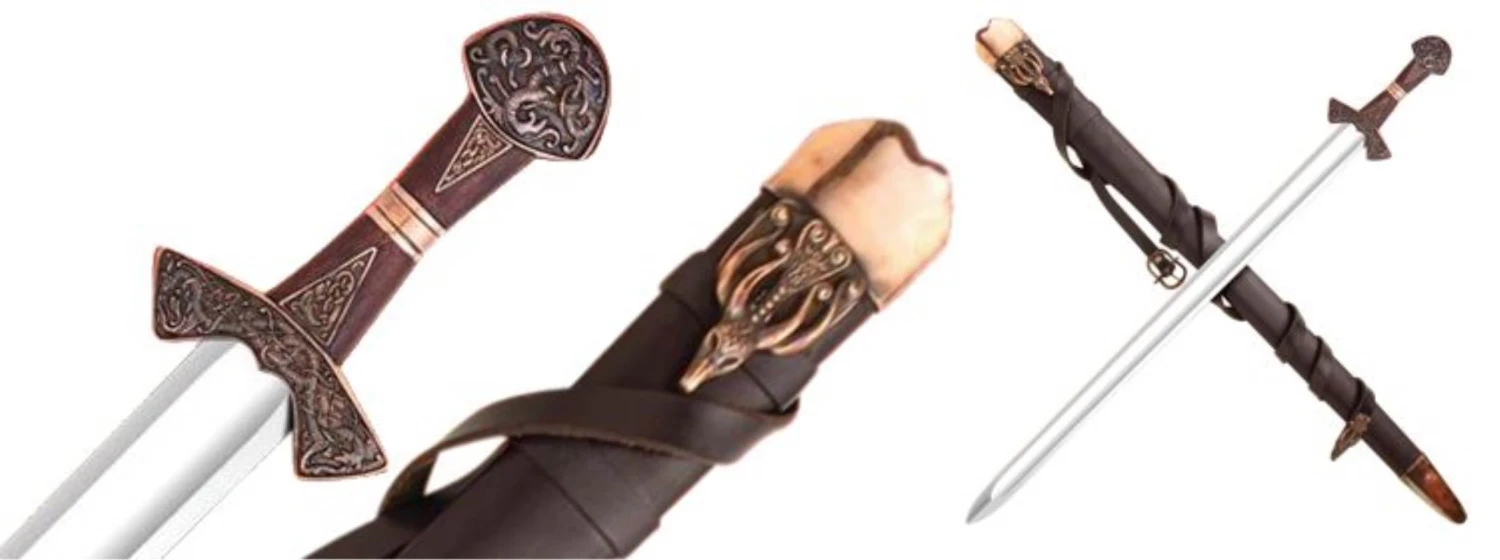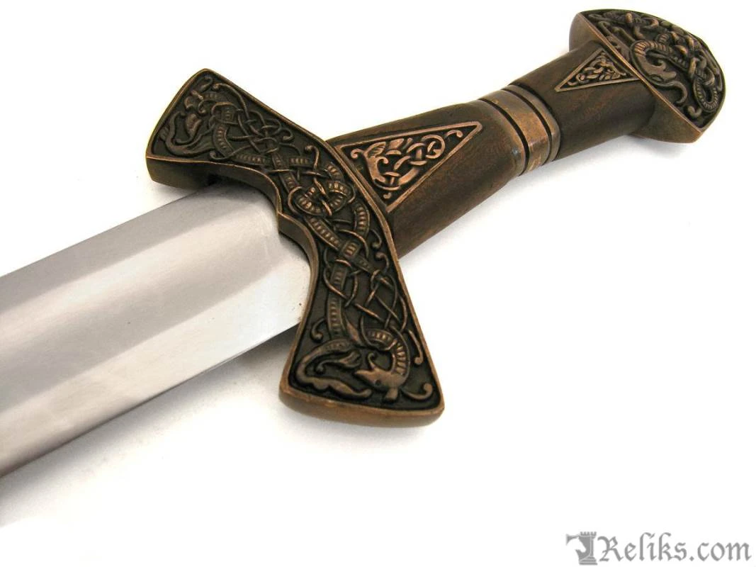 This is a reproduction of the original Suontaka sword that was excavated from a woman’s grave in Finland. The grave was dated 1100AD, however the swords form itself suggests and earlier date of origin. It would not be unusual for a sword like this to be a family sword which had been buried with it’s final heir. This stunning version of the famous viking sword features a highly detailed knot work pattern throughout the pommel, guard and grip with additional bands and inserts. The sword comes complete with a rich leather scabbard and matching with equally detailed fittings while sporting a baldric for wearing this powerful sword. All of the sword and scabbard fittings have been lavishly plated in a rich copper.