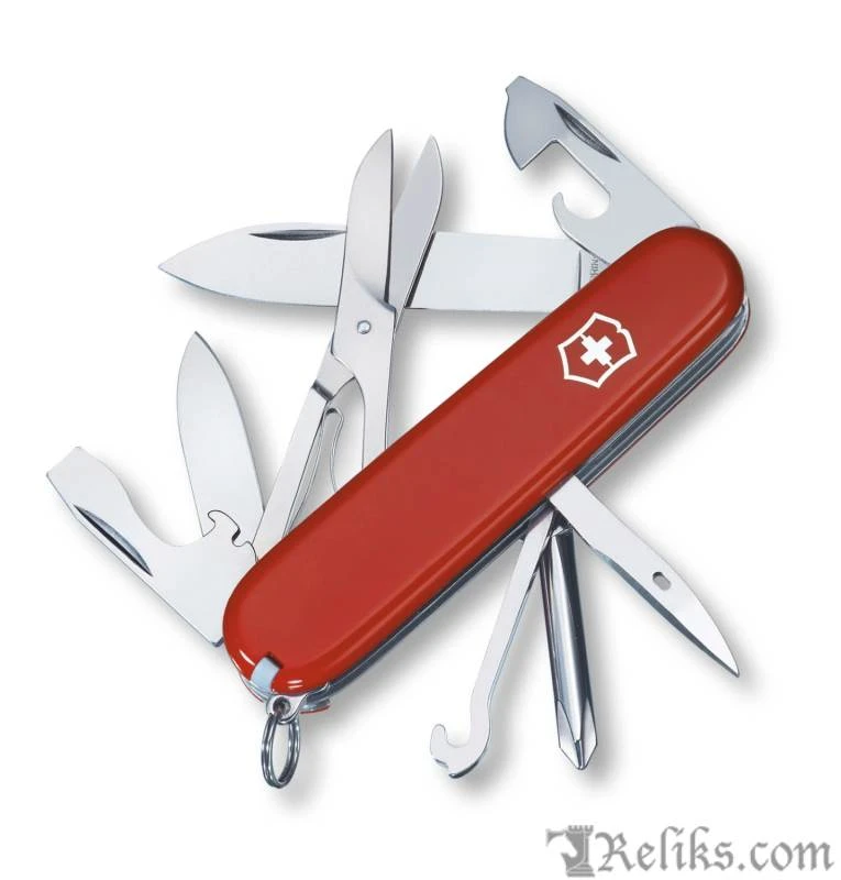 Features include:Large blade, Small blade, Can opener with small screwdriver, Bottle opener with large screwdriver & wire stripper, Scissors, Reamer with sewing eye, Phillips screwdriver, Hook, Toothpick, Tweezers and Key ring.