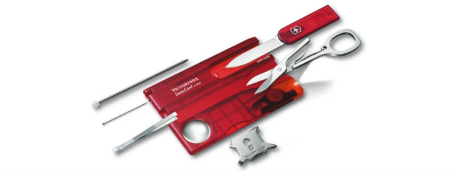The original Victorinox SwissCard broke new ground by offering a multi-functional tool that fits into your wallet. We’ve taken that concept a step further with the SwissCard Lite, adding a magnifying lens an a powerful LED light. Winner of the 2004 Red Dot design award for high design quality, the SwissCard Lite has received great reviews from the media and it’s users. Its features include a Letter opener (blade), Scissors, Straight pin, Pressurized ball point pen, Tweezers, Magnifying glass, Screwdriver 3mm, Screwdriver 5mm, Phillips screwdriver #00-0, Phillips screwdriver #1-2