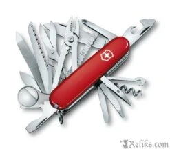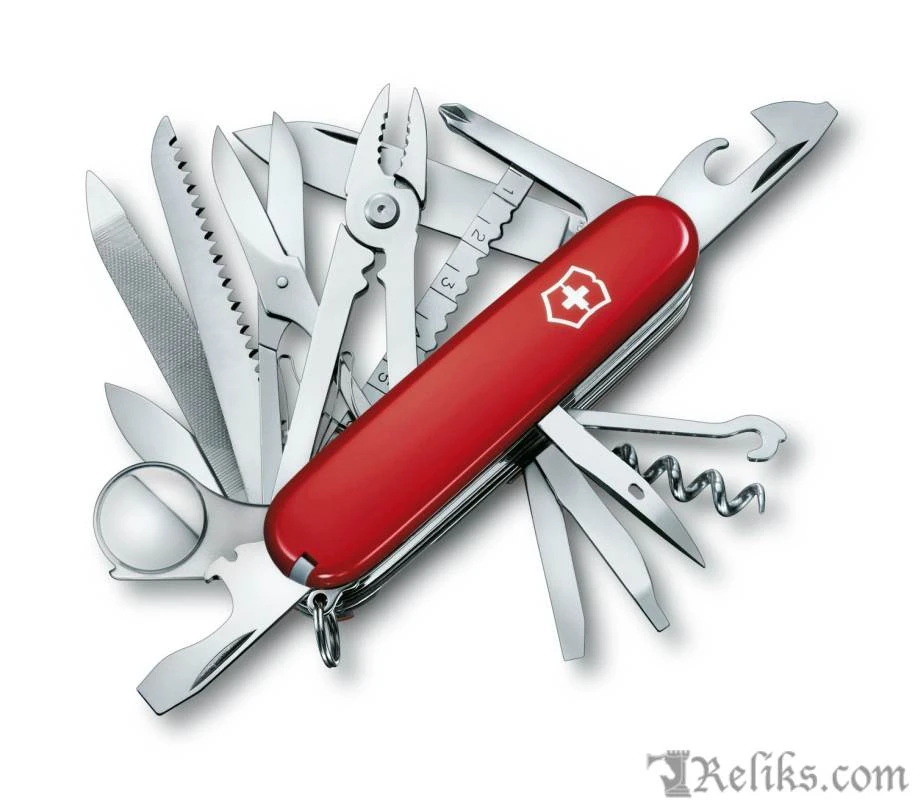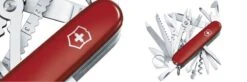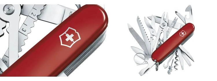 Features include:Large blade, Small blade, Can opener with small screwdriver, Bottle opener with large screwdriver & wire stripper, Scissors, Pliers with wire cutter, Wood saw, Fish scaler with hook disgorger & ruler, Metal saw with metal file & nail file, Magnifying glass, Reamer with sewing eye, Phillips screwdriver, Corkscrew, Hook, Wood chisel, Fine screwdriver, Mini screwdriver, Ball point pen, Straight pin, Toothpick, Tweezers and Key ring