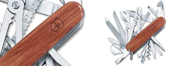 Titled SwissChamp for appropriate reasons, this Swiss Army Knife includes nearly every tool imaginable without adding significant bulk to your gear. This unique model offers a beautiful wood handle, making it a perfect gift item. With its hardwood handle, this version of the Classic SwissChamp is truly unique. Though wood grains and colors will vary knife to knife, the craftsmanship that goes into making one is consistently exemplary. The SwissChamp packs an impressive 33 implements