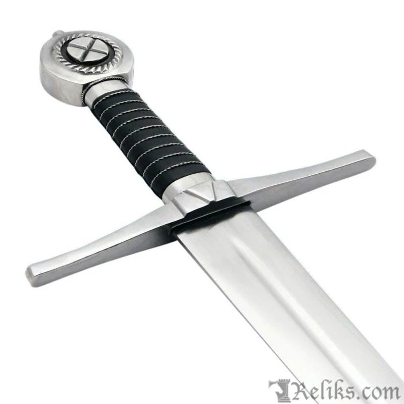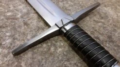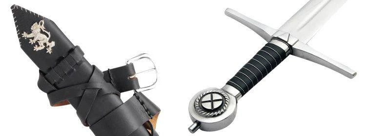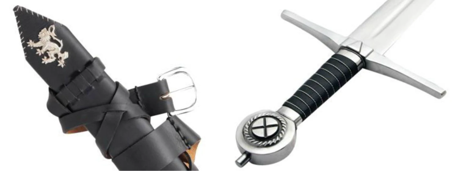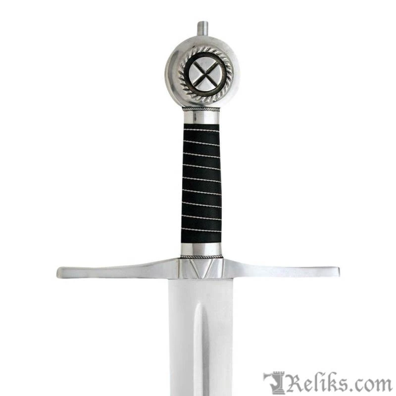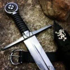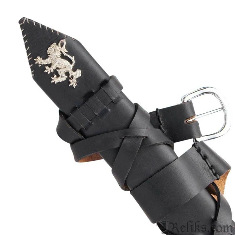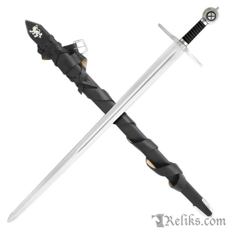 This heroic sword is as powerful as the man who would have wielded it. The master craftsmen of Windlass Steelcrafts have hand forged this blade of high carbon steel. The beautiful pommel emblazons the Cross of St. Andrew, while the hearty grip is wrapped in soft, black leather and held in place by a corded silver chain. This massive sword comes complete with a matching, thick black leather scabbard and sports a silver Lion of Scotland at its throat and a rounded silver metal shoe at its tip. A 1-1/2″ wide belt, measuring 56-1/2″ long, is attached. Comes factory sharp.